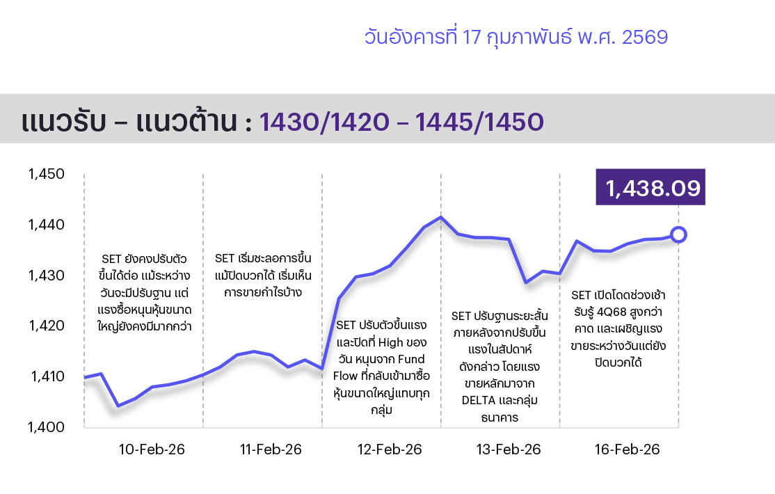 คาดตลาดแกว่งไซด์เวย์ Fund Flow ยังชะลอลดระดับการซื้อลง ติดตามความต่อเนื่องของกระแสเงินทุนต่อ GDP ไทย 4Q68 เติบโต 2.5% สูงกว่าคาด และ รมว. คลังประเมินปี 2569 จะโต 3% หากทำได้จะหนุนตลาดระยะกลาง ปัจจัยภายนอกติดตาม การเจรจาระหว่างสหรัฐฯ-อิหร่าน ซึ่งจะมีผลต่อราคาน้ำมัน และกรรมการเฟดหลายท่านกล่าวสุนทรพจน์ แต่คาดเฟดยังคงดอกเบี้ยต่อใน 1H69 ทางเทคนิค หากพักไม่นานไม่ควรหลุด 1430-1425 แนวต้าน 1445-1450 ผ่านได้จะขึ้นต่อ