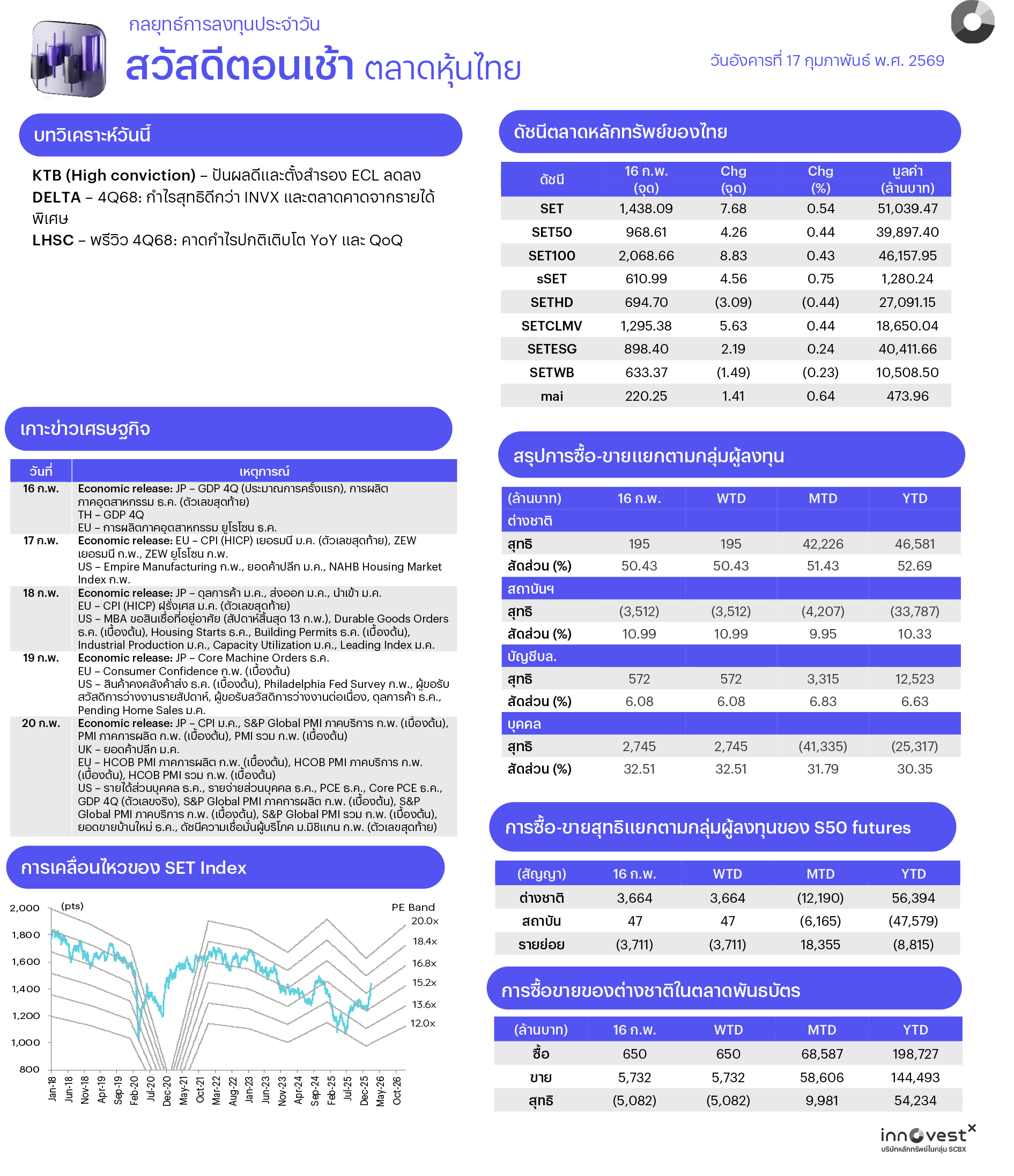 3. Trading Idea: นักลงทุนที่รับความเสี่ยงได้และต้องการเก็งกำไร แนะนำ 1) หุ้นที่จะได้ประโยชน์จากนโยบายเศรษฐกิจของพรรคภูมิใจไทยซึ่งเป็นแกนนำจัดตั้งรัฐบาลใหม่ และราคาหุ้นยังปรับขึ้น YTD น้อยกว่า SET แนะนำ กลุ่มธนาคาร (BBL KTB KBANK) กลุ่มพลังงานสะอาด (GPSC GUNKUL BANPU) กลุ่มค้าปลีก (CPALL BJC TNP) และกลุ่มการแพทย์และท่องเที่ยว (BDMS CENTEL ERW) 2) หุ้น Laggard Play เพื่อรับอานิสงส์จากการหมุนกลุ่มเล่นของ Fund Flow โดยเลือกหุ้น SET 50 ซึ่งราคาหุ้นปรับขึ้น YTD ต่ำกว่า SET และ Valuation ถูก โดยมี PBV และ PER 2569F < -1SD อีกทั้งมีพื้นฐานดี แนะนำ CENTEL CPALL HMPRO SAWAD BDMS 3) หุ้นที่คาดได้อานิสงส์จากความเสี่ยงทางภูมิรัฐศาสตร์ในตะวันออกกลาง โดยเน้นเก็งกำไรตามรอบข่าว แนะนำ PTTEP PTT TOP SPRC และ 4) หุ้นที่คาดได้อานิสงส์เม็ดเงินไหลเข้าหลัง MSCI Rebalance ซึ่งจะมีผลบังคับใช้ราคาปิดวันที่ 27 ก.พ. 2569 แนะนำหุ้นที่จะเข้า MSCI Global Small Cap อย่าง CRC IVL JTS ขณะที่ระมัดระวัง CPAXT ที่ออกจาก MSCI Global standard และ HANA JMT M PLANB ที่ออกจาก MSCI Global Small Cap