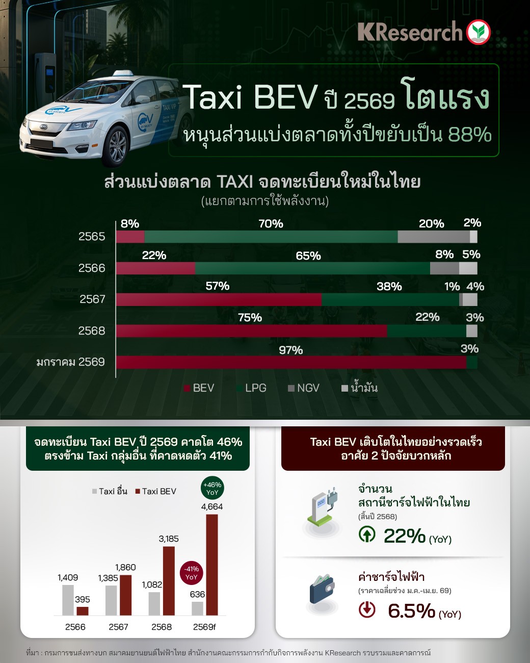 • ทั้งนี้ 2 ปัจจัยหลัก ที่สนับสนุนให้ Taxi BEV เติบโตขึ้นในไทยอย่างรวดเร็ว ได้แก่ จำนวนสถานีชาร์จไฟฟ้าในไทย ณ สิ้นปี 2568 ที่เพิ่มจำนวนขึ้น 22% (YoY) ทำให้สะดวกในการหาจุดชาร์จไฟ ขณะเดียวกันค่าชาร์จไฟฟ้าในช่วง 4 เดือนแรกของปี 2569 ที่ลดลง 6.5% (YoY) และยังไม่มีแนวโน้มปรับขึ้น ส่งผลให้การคืนทุนเกิดเร็วขึ้น