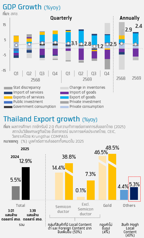 • Krungthai COMPASS ประเมินว่าเศรษฐกิจไทยปี 2569 จะขยายตัวที่ 1.8%YoY ท่ามกลางความท้าทาย แม้เศรษฐกิจไตรมาสที่ 4 ปี 2568 จะขยายตัวสูงกว่าที่คาด โดยระยะข้างหน้าความไม่แน่นอนจากมาตรการภาษี Reciprocal tariff ของสหรัฐฯ อีกทั้งในปีนี้สินค้าส่งออกหลักของไทยไปยังสหรัฐฯ มีความเสี่ยงได้รับผลกระทบเพิ่มเติมจากภาษี Sectoral tariff โดยเฉพาะกลุ่ม semiconductor อย่างไรก็ดี การลงทุนภาคเอกชนคาดว่าจะขยายตัวต่อเนื่อง สะท้อนจากยอดขอรับการส่งเสริมการลงทุน และความเชื่อมั่นที่มีแนวโน้มปรับดีขึ้นหลังผลการเลือกตั้งแสดงทิศทางการจัดตั้งรัฐบาลใหม่ที่มีเสถียรภาพ