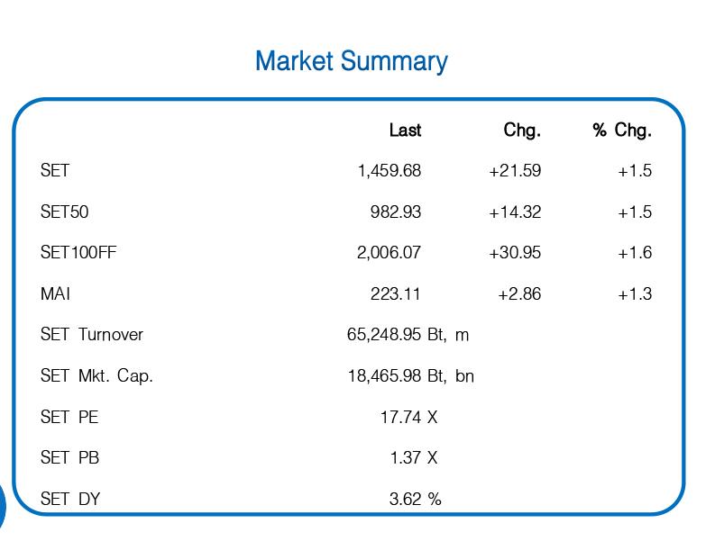 ไซด์เวย์อัพ – โมเมนตัมเงินต่างชาติไหลเข้าที่แข็งแกร่งกว่าคาด ยังช่วยหนุน SET แกว่งไซด์เวย์อัพ ผสานกับข่าวเชิงบวกเกี่ยวกับแผนซื้อหุ้นคืนของ TTB และผลประกอบการของ GULF ที่ดีและจ่ายปันผลพิเศษ ช่วยกระตุ้นแรงซื้อเก็งกำไรคาดหวังการจ่ายเงินปันผลพิเศษในบจ.อื่น ๆ รอบนี้ด้วย แนวรับ 1445-50 แนวต้าน 1470, 1485-90