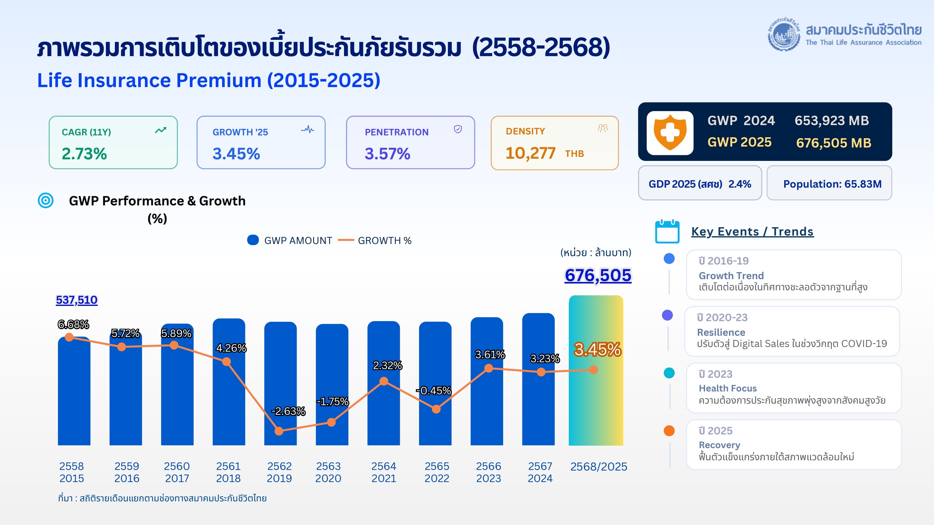 นางนุสรา (อัสสกุล) บัญญัติปิยพจน์ นายกสมาคมประกันชีวิตไทย เปิดเผยว่า เผยภาพรวมธุรกิจประกันชีวิตของปี 2568 ระหว่าง มกราคม - ธันวาคม มีเบี้ยประกันภัยรับรวม (Total Premium) อยู่ที่ 676,505 ล้านบาท เติบโตเพิ่มขึ้นร้อยละ 3.45 เมื่อเทียบกับปี 2567 จำแนกเป็น เบี้ยประกันภัยรับรายใหม่ (New Business Premium) 190,886 ล้านบาท อัตราการเติบโตเพิ่มขึ้นร้อยละ 3.60 และเบี้ยประกันภัยรับปีต่อไป (Renewal Premium) 485,619 ล้านบาทมีอัตราการเติบโตเพิ่มขึ้นร้อยละ 3.40 คิดเป็นอัตราความคงอยู่ของกรมธรรม์ร้อยละ 82