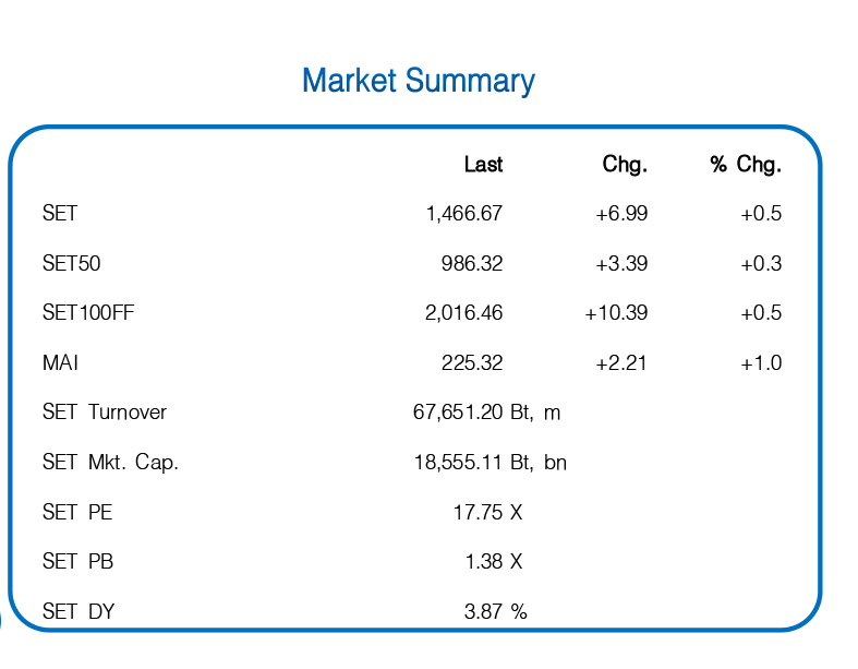 เงินนอกเข้า + เก็งปันผล – SET แกว่งอิงแดนบวกในกรอบ 1456-70 ปรับขึ้น 3 วันติด อานิสงส์หุ้นกลุ่มแบงก์, ค้าปลีก และขนส่งปรับตัวขึ้น หลัง TTB ประกาศแผนซื้อหุ้นคืนเพิ่มเติม และสัญญาณนทท.จีนฟื้นตัวเร่งขึ้น ผสานกับแรงซื้อหวังเงินปันผล ต่างชาติซื้อสุทธิ 2.02 พันลบ. 3 วันติด แต่พลิก Short S50 Futures 6,452 สัญญา