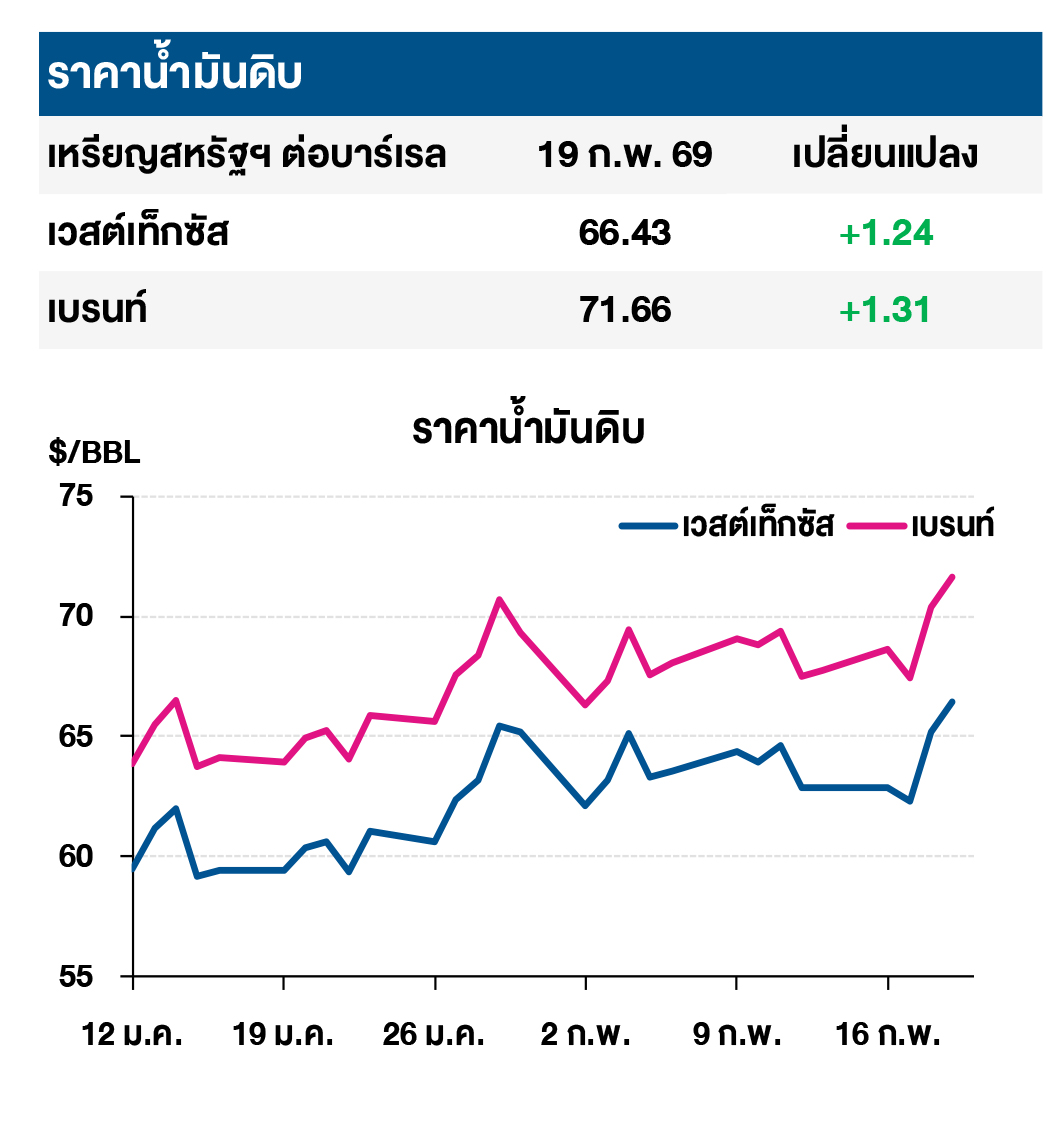 (+) การส่งออกน้ำมันดิบของซาอุดิอาระเบียปรับลดลง ในเดือน ธ.ค. 68 เหลือเพียง 6.99 ล้านบาร์เรลต่อวัน ซึ่งเป็นระดับที่ต่ำที่สุดตั้งแต่ เดือน ก.ย. 68 อย่างไรก็ดี ตลาดคาดการณ์กลุ่มโอเปกพลัสจะมีแนวโน้มที่จะกลับมาเพิ่มปริมาณการผลิตน้ำมันดิบอีกครั้ง ในไตรมาสที่ 2 ท่ามกลางการคาดการณ์การใช้น้ำมันดิบทั่วโลกที่จะปรับลดลงราว 400,000 บาร์เรลก็ตาม