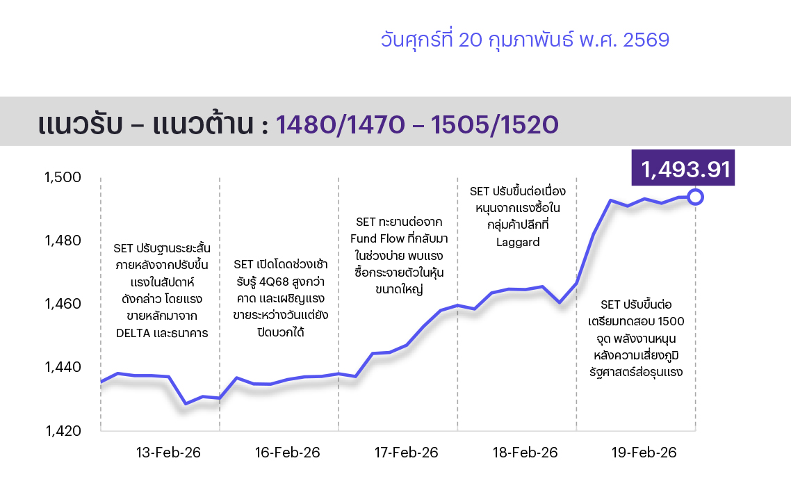 คาดตลาดมีช่วงแกว่งขึ้น แต่ระวังการชะลอตัวสั้นตามแนวต้าน แนวโน้ม Fund Flow ยังไหลเข้าต่อ ประเด็นทางการเมืองรอการประกาศผลการเลือกตั้งอย่างเป็นทางการ ส่วนเรื่องบาร์โค้ดต้องจับตาหลัง ปัจจัยภายนอก ติดตามสหรัฐฯ จะโจมตีอิหร่านหรือไม่ หลังสหรัฐฯ ขู่เปิดปฏิบัติการทหารภายใน 10 วัน หากอิหร่านไม่ยอมรับข้อตกลง หากบานปลายอาจกดดันจิตวิทยาการลงทุน แต่ช่วงสั้นหนุนหุ้นพลังงาน ทางเทคนิค การขึ้นต่อระวังการชะลอสั้นที่ 1505/1520 แม้ระยะกลางเป็นบวก