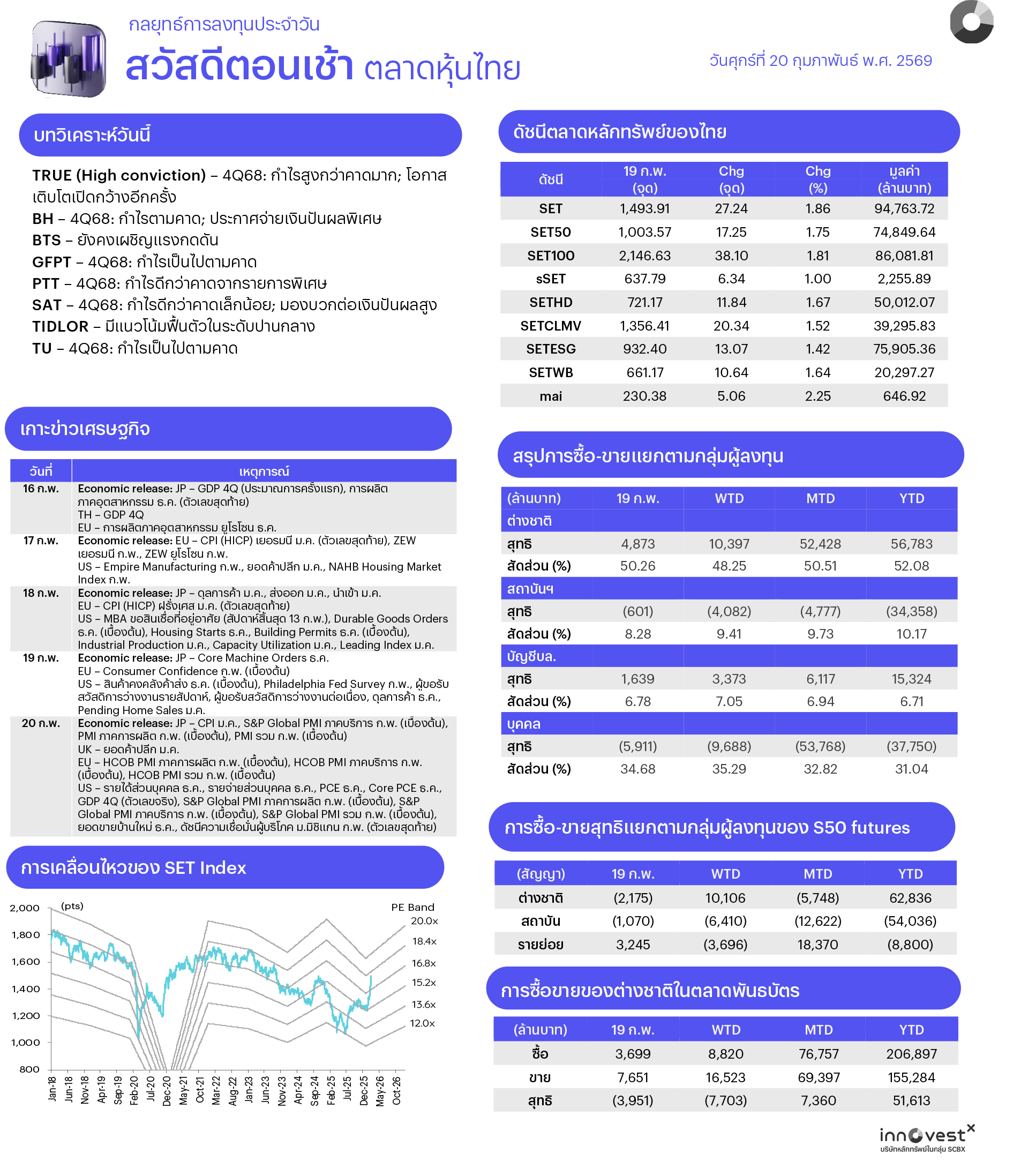 3. Trading Idea: นักลงทุนที่รับความเสี่ยงได้และต้องการเก็งกำไร แนะนำ 1) หุ้นที่จะได้ประโยชน์จากนโยบายเศรษฐกิจของพรรคภูมิใจไทยซึ่งเป็นแกนนำจัดตั้งรัฐบาลใหม่ และราคาหุ้นยังปรับขึ้น YTD น้อยกว่า SET ได้แก่ กลุ่มธนาคาร (BBL KTB KBANK) กลุ่มพลังงานสะอาด (GPSC GUNKUL BANPU) กลุ่มค้าปลีก (CPALL BJC TNP) และกลุ่มการแพทย์และท่องเที่ยว (BDMS CENTEL ERW) 2) หุ้น Laggard Play เพื่อรับอานิสงส์จากการหมุนกลุ่มเล่นของ Fund Flow โดยเลือกหุ้น SET 50 ซึ่งราคาหุ้นปรับขึ้น YTD ต่ำกว่า SET และ Valuation ถูก โดยมี PBV และ PER 2569F < -1SD อีกทั้งมีพื้นฐานดี ได้แก่ CENTEL CPALL HMPRO SAWAD BDMS 3) หุ้นที่คาดได้อานิสงส์จากความเสี่ยงทางภูมิรัฐศาสตร์ในตะวันออกกลาง โดยเน้นเก็งกำไรตามรอบข่าว ได้แก่ PTTEP PTT TOP SPRC และ 4) หุ้นที่คาดได้อานิสงส์เม็ดเงินไหลเข้าหลัง MSCI Rebalance ซึ่งจะมีผลบังคับใช้ราคาปิดวันที่ 27 ก.พ. 2569 ได้แก่หุ้นที่จะเข้า MSCI Global Small Cap อย่าง CRC IVL JTS ขณะที่ระมัดระวัง CPAXT ที่ออกจาก MSCI Global standard และ HANA JMT M PLANB ที่ออกจาก MSCI Global Small Cap