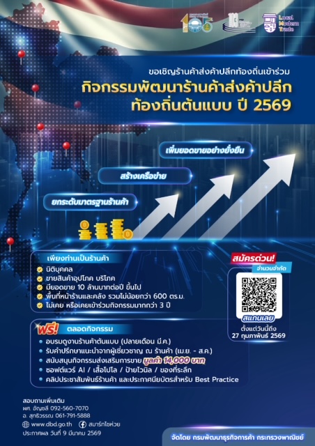 กรมพัฒนาธุรกิจการค้า เดินหน้าพัฒนาศักยภาพผู้ประกอบการค้าส่งค้าปลีกท้องถิ่นทั่วประเทศต่อเนื่อง เสริมสร้างความเข้มแข็งให้ระบบเศรษฐกิจฐานราก พร้อมยกระดับร้านค้าท้องถิ่นให้สามารถแข่งขันได้อย่างยั่งยืน เชิญชวนผู้ประกอบการร้านค้าส่งค้าปลีกท้องถิ่นที่สนใจ สมัครเข้าร่วมกิจกรรมพัฒนาร้านค้าส่งค้าปลีกท้องถิ่นต้นแบบ ปี 2569 ตั้งแต่บัดนี้จนถึงวันที่ 27 กุมภาพันธ์ 2569 ทางเว็บไซต์กรมพัฒนาธุรกิจการค้า www.dbd.go.th