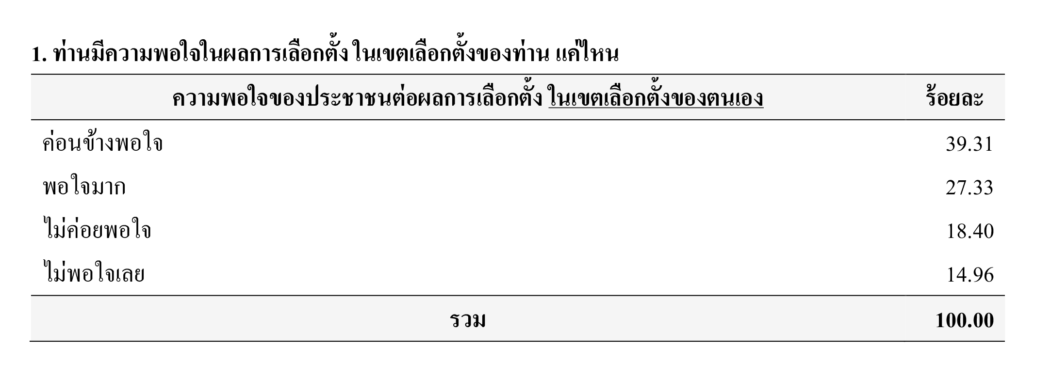 จากการสำรวจเมื่อถามความพอใจของประชาชนต่อผลการเลือกตั้ง ในเขตเลือกตั้งของตนเอง พบว่า ตัวอย่าง ร้อยละ 39.31 ระบุว่า ค่อนข้างพอใจ รองลงมา ร้อยละ 27.33 ระบุว่า พอใจมาก ร้อยละ 18.40 ระบุว่า ไม่ค่อยพอใจ และร้อยละ 14.96 ระบุว่า ไม่พอใจเลย