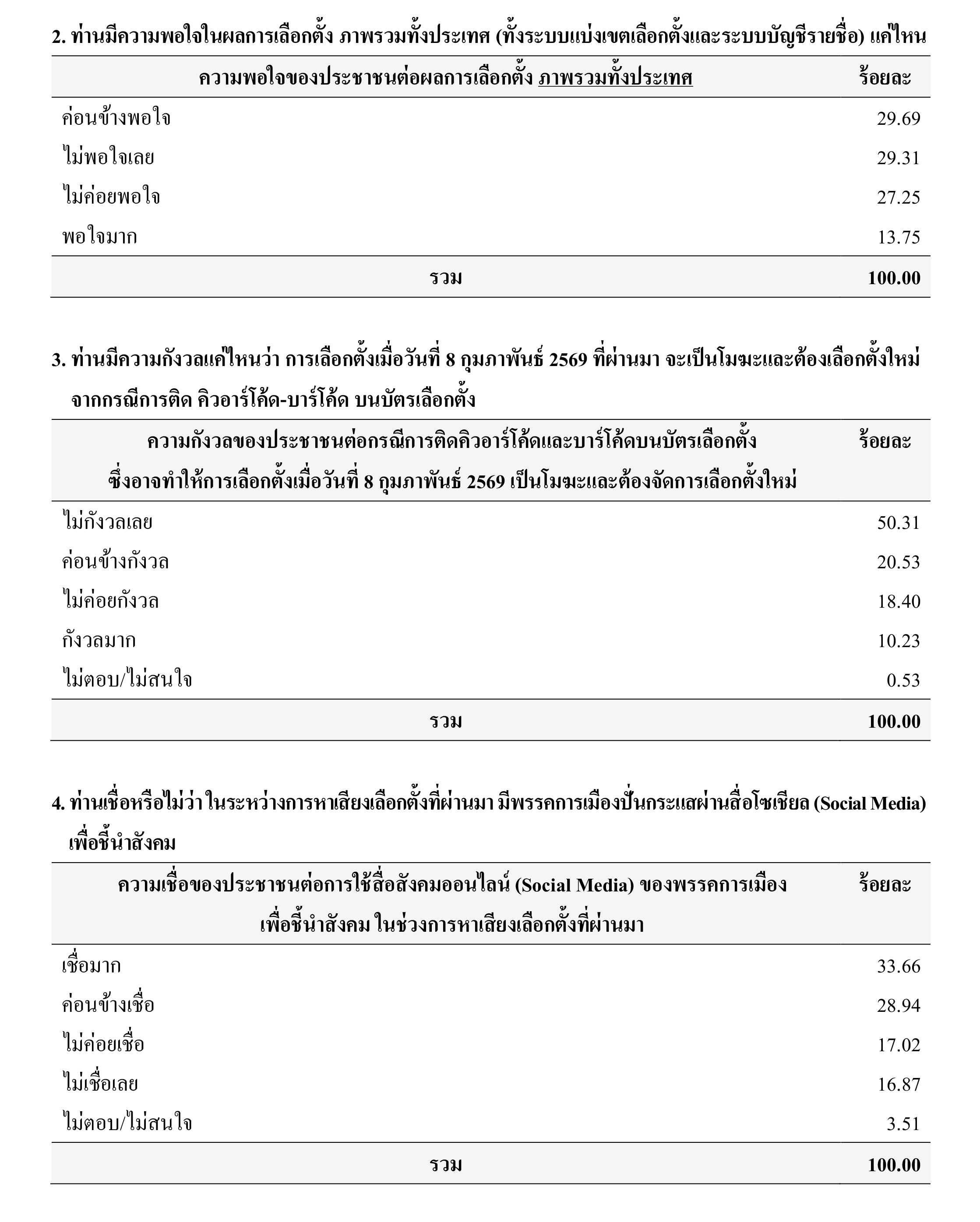 สำหรับความกังวลของประชาชนต่อกรณีการติดคิวอาร์โค้ดและบาร์โค้ดบนบัตรเลือกตั้ง ซึ่งอาจทำให้ การเลือกตั้งเมื่อวันที่ 8 กุมภาพันธ์ 2569 เป็นโมฆะและต้องจัดการเลือกตั้งใหม่ พบว่า ตัวอย่าง ร้อยละ 50.31 ระบุว่า ไม่กังวลเลย รองลงมา ร้อยละ 20.53 ระบุว่า ค่อนข้างกังวล ร้อยละ 18.40 ระบุว่า ไม่ค่อยกังวล ร้อยละ 10.23 ระบุว่า กังวลมาก และร้อยละ 0.53 ระบุว่า ไม่ตอบ/ไม่สนใจ