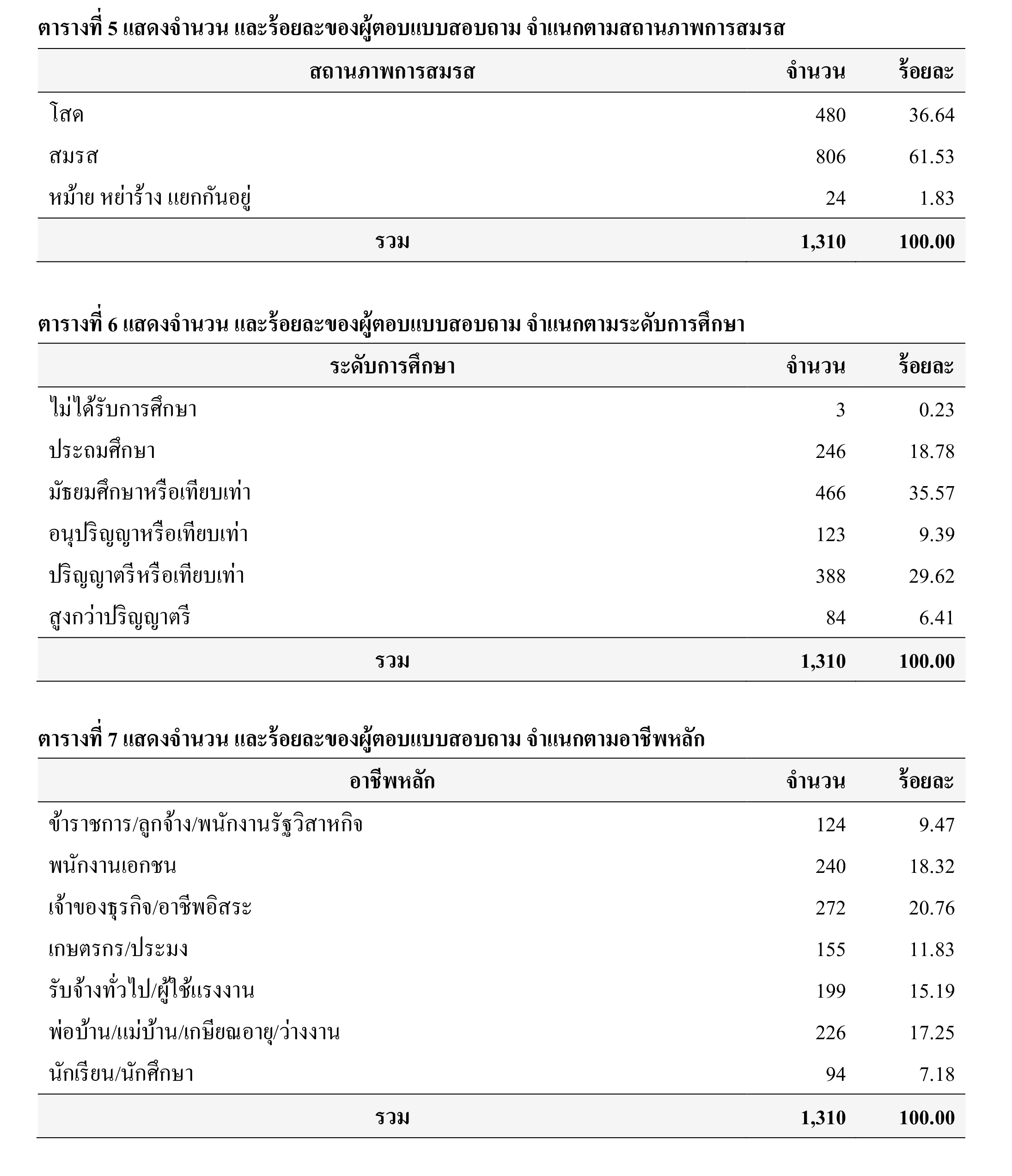 ตัวอย่าง ร้อยละ 36.64 สถานภาพโสด ร้อยละ 61.53 สมรส และร้อยละ 1.83 หม้าย หย่าร้าง แยกกันอยู่ โดยตัวอย่าง ร้อยละ 0.23 ไม่ได้รับการศึกษา ร้อยละ 18.78 จบการศึกษาประถมศึกษา ร้อยละ 35.57 จบการศึกษามัธยมศึกษาหรือเทียบเท่า ร้อยละ 9.39 จบการศึกษาอนุปริญญาหรือเทียบเท่า ร้อยละ 29.62 จบการศึกษาปริญญาตรีหรือเทียบเท่า และร้อยละ 6.41 จบการศึกษาสูงกว่าปริญญาตรี
