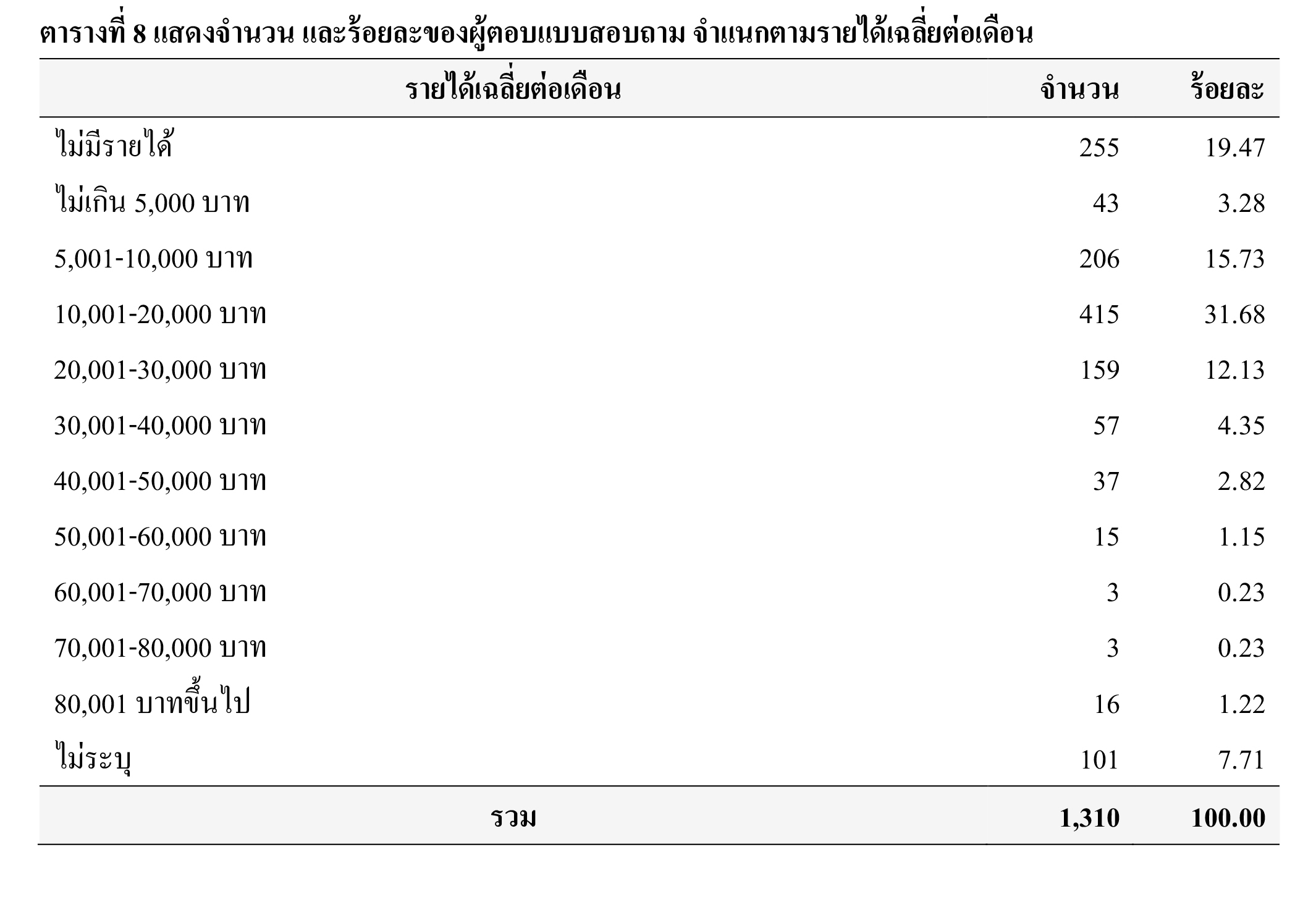 ตัวอย่าง ร้อยละ 19.47 ไม่มีรายได้ ร้อยละ 3.28 รายได้เฉลี่ยต่อเดือนไม่เกิน 5,000 บาท ร้อยละ 15.73 รายได้เฉลี่ยต่อเดือน 5,001-10,000 บาท ร้อยละ 31.68 รายได้เฉลี่ยต่อเดือน 10,001-20,000 บาท ร้อยละ 12.13 รายได้เฉลี่ยต่อเดือน 20,001-30,000 บาท ร้อยละ 4.35 รายได้เฉลี่ยต่อเดือน 30,001-40,000 บาท ร้อยละ 2.82 รายได้เฉลี่ยต่อเดือน 40,001-50,000 บาท ร้อยละ 1.15 รายได้เฉลี่ยต่อเดือน 50,001-60,000 บาท ร้อยละ 0.23 รายได้เฉลี่ยต่อเดือน 60,001-70,000 บาท และรายได้เฉลี่ยต่อเดือน 70,001-80,000 บาท ในสัดส่วนที่เท่ากัน ร้อยละ 1.22 รายได้เฉลี่ยต่อเดือน 80,001 บาทขึ้นไป และร้อยละ 7.71 ไม่ระบุรายได้