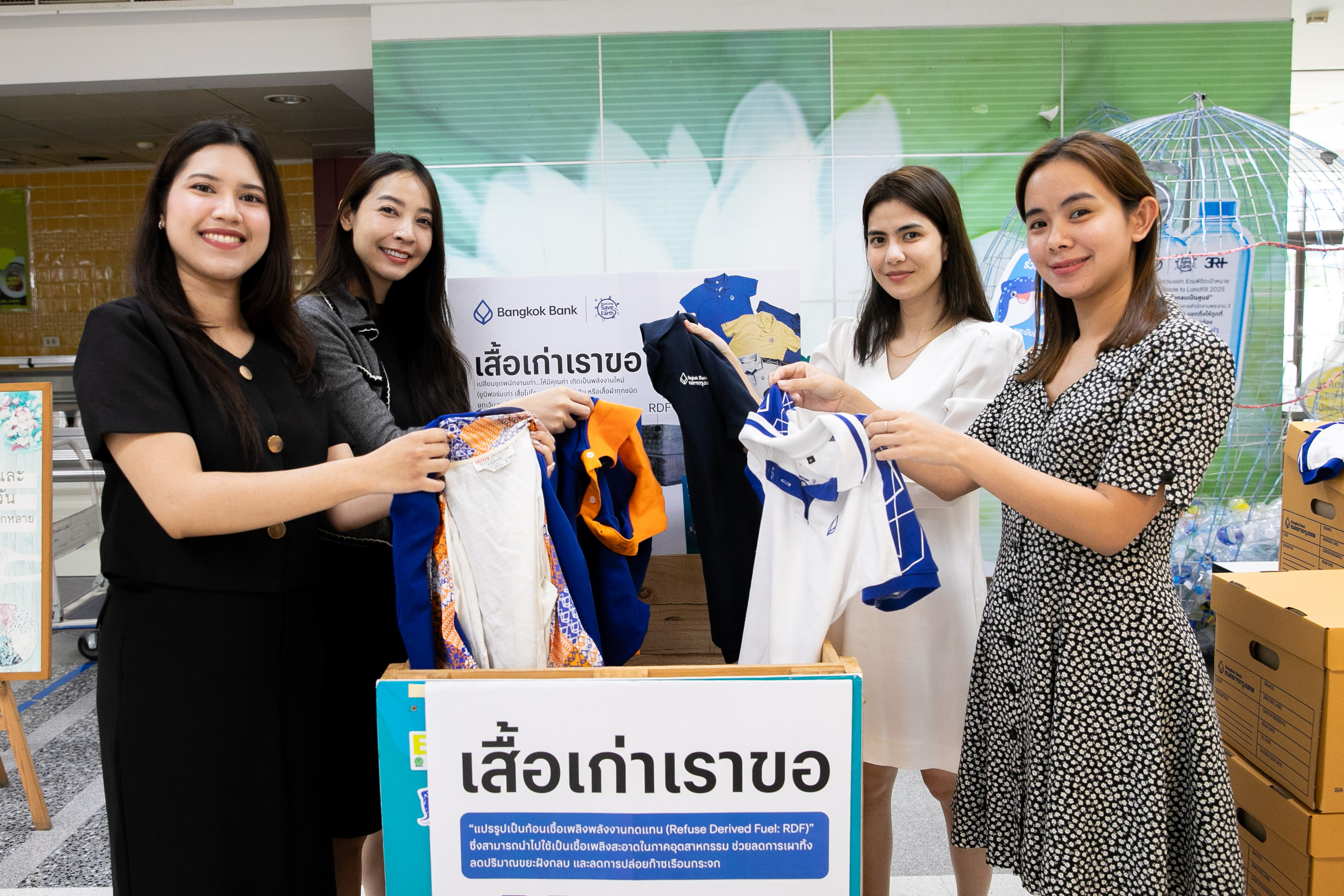 เสื้อเก่าเราขอ - ธนาคารกรุงเทพ จำกัด (มหาชน) โดย นายกอบศักดิ์ ภูตระกูล กรรมการรองผู้จัดการใหญ่ เป็นผู้แทนร่วมส่งมอบชุดเครื่องแบบพนักงานเก่า รวมถึงเสื้อผ้าที่ไม่ใช้แล้วของพนักงาน รวมกว่า 7,000 ชิ้น ช่วยลดการปล่อยก๊าซเรือนกระจกได้ 0.0874 ตันคาร์บอนไดออกไซด์เทียบเท่าต่อปี เทียบเท่าการปลูกต้นไม้ 5.83 ต้น ภายใต้กิจกรรม “เสื้อเก่าเราขอ” ให้แก่ บริษัท เบตเตอร์ เวิลด์ กรีน จำกัด (มหาชน) โดยมี นางพรเพ็ญ เผ่ารัชตพิบูลย์ รองกรรมการผู้จัดการสายงานปฏิบัติการ เป็นตัวแทนรับมอบ ณ ธนาคารกรุงเทพ สำนักงานใหญ่ สีลม เพื่อส่งต่อเข้าสู่กระบวนการแปรรูปเป็นเชื้อเพลิง RDF (Refuse Derived Fuel) ซึ่งเป็นพลังงานสะอาดที่สามารถใช้ทดแทนเชื้อเพลิงฟอสซิลในภาคอุตสาหกรรม ช่วยลดการเผาทิ้ง ลดปริมาณขยะฝังกลบ และลดการปล่อยก๊าซเรือนกระจกได้อย่างเป็นรูปธรรม โดยกิจกรรมครั้งนี้เป็นส่วนหนึ่งของโครงการ Bualuang Save the Earth ที่ได้จัดกิจกรรมมาอย่างต่อเนื่อง