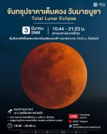 สถาบันวิจัยดาราศาสตร์แห่งชาติ (องค์การมหาชน) (สดร.) หรือ NARIT กระทรวงการอุดมศึกษา วิทยาศาสตร์ วิจัย และนวัตกรรม (อว.) เผยวันที่ 3 มีนาคม 2569 ตรงกับวันมาฆบูชา จะเกิดปรากฏการณ์ "จันทรุปราคาเต็มดวง" เวลาประมาณ 15:44 - 21:23 น. (ตามเวลาประเทศไทย ณ กรุงเทพมหานคร)