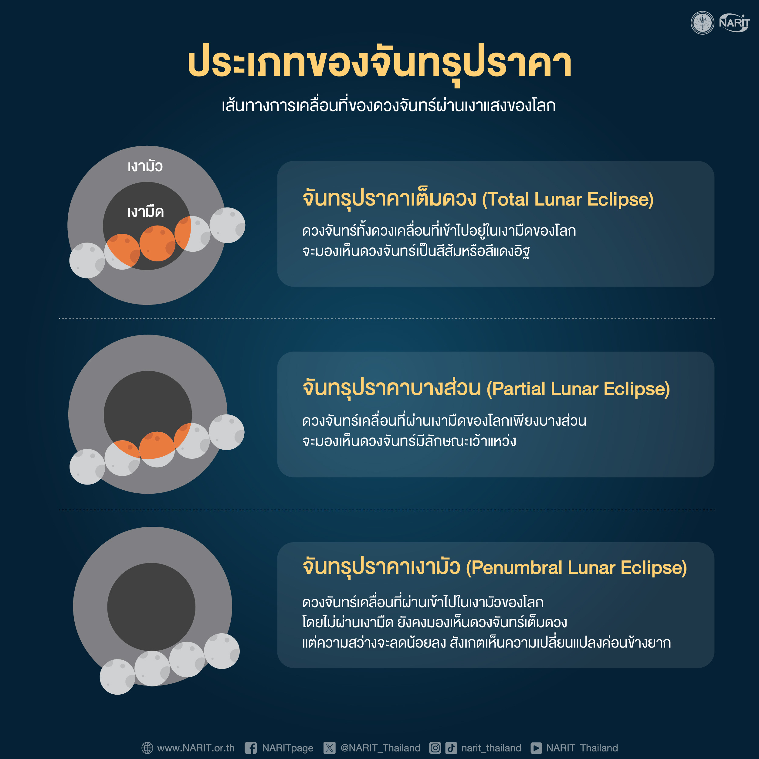 สดร. เปิด 5 จุดสังเกตการณ์หลัก เชิญชวนประชาชนชมปรากฏการณ์ “จันทรุปราคาเต็มดวง” ในวันมาฆบูชา และชมวัตถุท้องฟ้าที่น่าสนใจคืนวันที่ 3 มีนาคม 2569 ตั้งแต่เวลา 18:00 - 22:00 น. ณ อุทยานดาราศาสตร์สิรินธร อ. แม่ริม จ. เชียงใหม่ และหอดูดาวเฉลิมพระเกียรติ 7 รอบ พระชนมพรรษา นครราชสีมา ขอนแก่น ฉะเชิงเทรา และสงขลา เข้าร่วมฟรี ไม่มีค่าใช้จ่าย หรือชมถ่ายทอดสดปรากฏการณ์ทางเพจเฟซบุ๊ก และยูทูบ NARIT สถาบันวิจัยดาราศาสตร์แห่งชาติ