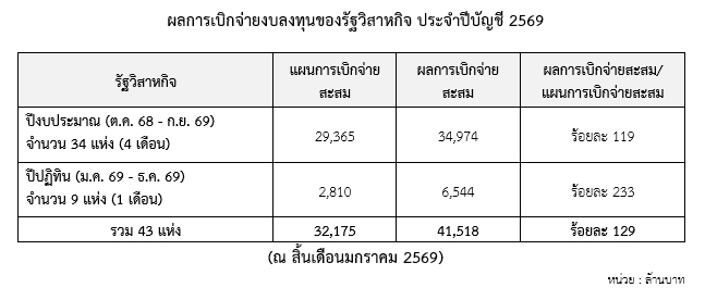 นายธิบดี วัฒนกุล ผู้อำนวยการสำนักงานคณะกรรมการนโยบายรัฐวิสาหกิจ เปิดเผยว่า การเบิกจ่ายงบลงทุนของรัฐวิสาหกิจที่อยู่ในการติดตามของสำนักงานคณะกรรมการนโยบายรัฐวิสาหกิจ (สคร.) อย่างใกล้ชิด จำนวน 43 แห่ง แบ่งออกเป็น 2 กลุ่ม ได้แก่ กลุ่มรัฐวิสาหกิจที่ใช้ปีบัญชีตามปีงบประมาณ (รัฐวิสาหกิจปีงบประมาณ) และกลุ่มรัฐวิสาหกิจที่ใช้ปีบัญชีตามปีปฏิทิน (รัฐวิสาหกิจปีปฏิทิน) โดยในปีบัญชี 2569 รัฐวิสาหกิจมีกรอบงบลงทุน จำนวน 240,926 ล้านบาท และมีผลการเบิกจ่ายสะสมจนถึงสิ้นเดือนมกราคม 2569 จำนวน 41,518 ล้านบาท หรือคิดเป็นร้อยละ 129 ของแผนการเบิกจ่ายสะสม ประกอบด้วยการเบิกจ่ายงบลงทุนของรัฐวิสาหกิจปีงบประมาณ (ตั้งแต่เดือนตุลาคม 2568 - เดือนมกราคม 2569) 34 แห่ง จำนวน 34,974 ล้านบาท หรือคิดเป็นร้อยละ 119 ของแผนการเบิกจ่ายสะสม และรัฐวิสาหกิจปีปฏิทิน (เดือนมกราคม 2569) 9 แห่ง จำนวน 6,544 ล้านบาท หรือคิดเป็นร้อยละ 233 ของแผนการเบิกจ่ายสะสม ทั้งนี้ รัฐวิสาหกิจปีงบประมาณที่เบิกจ่ายได้ไม่ต่ำกว่าร้อยละ 95 ของแผนการเบิกจ่ายสะสมและมีมูลค่าสูงสุด 3 อันดับแรก ได้แก่ การรถไฟแห่งประเทศไทย (รฟท.) การรถไฟฟ้าขนส่งมวลชนแห่งประเทศไทย (รฟม.) และการประปาส่วนภูมิภาค และรัฐวิสาหกิจปีปฏิทินที่เบิกจ่ายได้ไม่ต่ำกว่าร้อยละ 95 ของแผนการเบิกจ่ายสะสมและมีมูลค่าสูงสุด 3 อันดับแรก ได้แก่ การไฟฟ้าฝ่ายผลิตแห่งประเทศไทย การไฟฟ้านครหลวง และการไฟฟ้าส่วนภูมิภาค