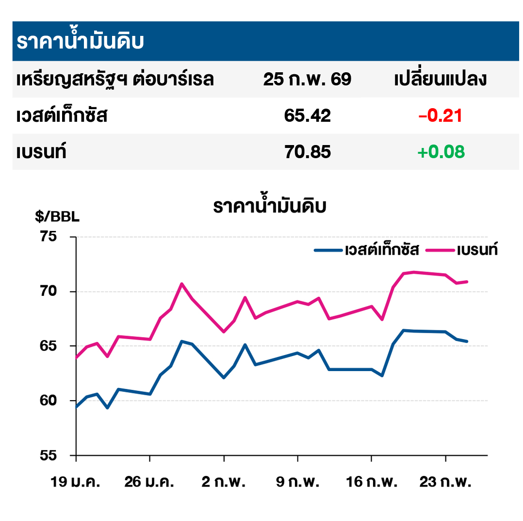 (-) ปริมาณดิบสำรองสหรัฐ ปรับตัวสูงขึ้นอย่างมาก โดยสำนักงานสารสนเทศด้านพลังงานของสหรัฐฯ (EIA) เผยตัวเลขน้ำมันดิบ คงคลังสหรัฐฯ ประจำสัปดาห์สิ้นสุด ณ วันที่ 20 ก.พ. 69 ปรับเพิ่มขึ้น 16 ล้านบาร์เรลมากกว่าที่นักวิเคราะห์คาดการณ์ว่าจะปรับเพิ่มขึ้นพียง 1.5 ล้านบาร์เรล