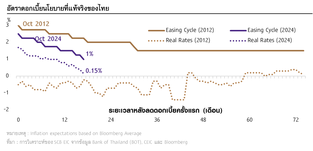 Easing cycle ในรอบนี้ จึงเป็นการทยอยผ่อนคลายภาวะการเงินให้สอดคล้องกับบริบทเศรษฐกิจไทย ซึ่งเผชิญความเปราะบางจากภายใน และปัจจัยกดดันจากภายนอก ทั้งประเด็นภูมิรัฐศาสตร์ และการกีดกันทางการค้า อัตราดอกเบี้ยนโยบายจึงอาจไม่ลงไปอยู่ในระดับต่ำมากเหมือนช่วง COVID-19 ที่เศรษฐกิจไทยหดตัวรุนแรง