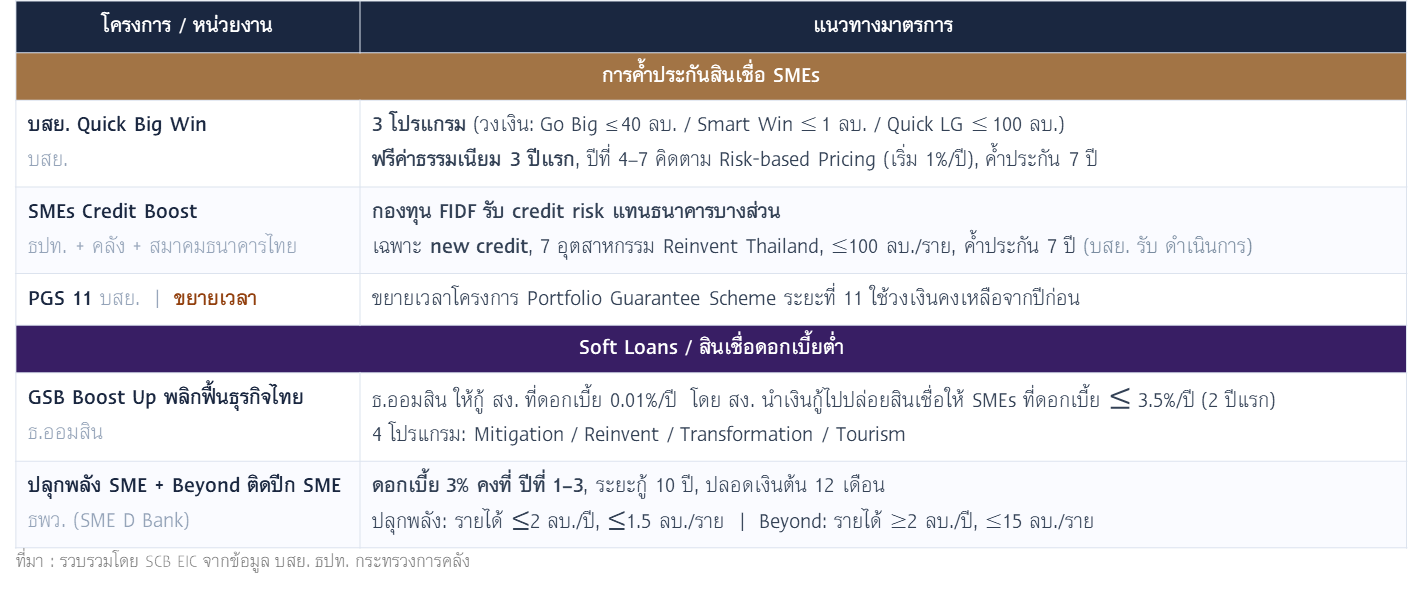 • การเน้นย้ำเรื่องนโยบายปรับโครงสร้างเศรษฐกิจ และมาตรการทางการเงินเฉพาะจุด อาจเป็นการส่งสัญญาณว่า กนง. ได้ใช้เครื่องมือดอกเบี้ยอย่างเต็มที่ในระดับหนึ่งแล้ว การลดดอกเบี้ยต่อเนื่องอีกอาจไม่ได้ช่วยแก้ไขปัญหาเศรษฐกิจไทยได้มากนัก และอาจกระทบต่อประสิทธิผลในการส่งผ่านนโยบายการเงินได้ โดย ธปท. เริ่มดำเนินนโยบายรอบด้านประสานกับรัฐบาลมากขึ้นในการแก้ไขปัญหาเศรษฐกิจไทย ผ่านมาตรการทางการเงินที่เน้นช่วยเหลือกลุ่มครัวเรือน (รูปที่ 2) และ SMEs (รูปที่ 3)