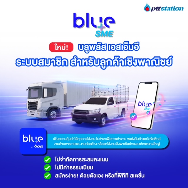 พีทีที สเตชั่น (PTT Station) และ blueplus+ ประกาศข่าวดีครั้งสำคัญสำหรับผู้ใช้งานน้ำมันเชิงพาณิชย์ทั่วประเทศ ด้วยการเปิดตัวระบบสมาชิกรูปแบบใหม่ภายใต้ชื่อ "blueplus+ SME" ชูจุดเด่นการสะสมคะแนนบลูพลัสได้แบบ “ไม่จำกัดจำนวน (Unlimited)” เพื่อตอบโจทย์ภาคธุรกิจที่ต้องการความคุ้มค่าสูงสุดในทุกการเดินทางและการดำเนินงาน