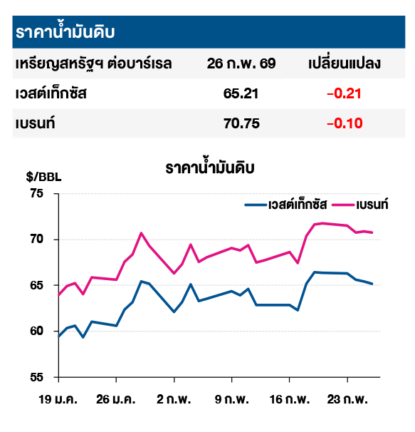 (-) ราคาน้ำมันดิบเวสต์เท็กซัสและเบรนท์ปรับลดลง หลังตลาดยังคงจับตาการเจรจาระหว่างสหรัฐฯ และ อิหร่าน ที่ยังคงยืดเยื้อ หลังมีการเจรจาที่กรุงเจนีวา เมื่อวันที่ 26 ก.พ. 69 ที่ผ่านมา โดยกระทรวงการต่างประเทศอิหร่านกล่าวว่า อิหร่านควรมีสิทธิที่จะใช้พลังงานนิวเคลียร์เพื่อสันติและสหรัฐฯ ควรยกเลิกการคว่ำบาตร ในขณะที่สหรัฐฯ ยังคงยืนยันที่จะให้ประเทศอิหร่านงดการเสริมสมรรถนะยูเรเนียม และเรียกร้องให้อิหร่านส่งมอบยูเรเนียมเสริมสมรรถนะร้อยละ 60 ทั้งหมดให้สหรัฐฯ รวมทั้งประธานาธิบดีสหรัฐฯ มีการสั่งการให้เสริมกองกำลังเพิ่มเติม