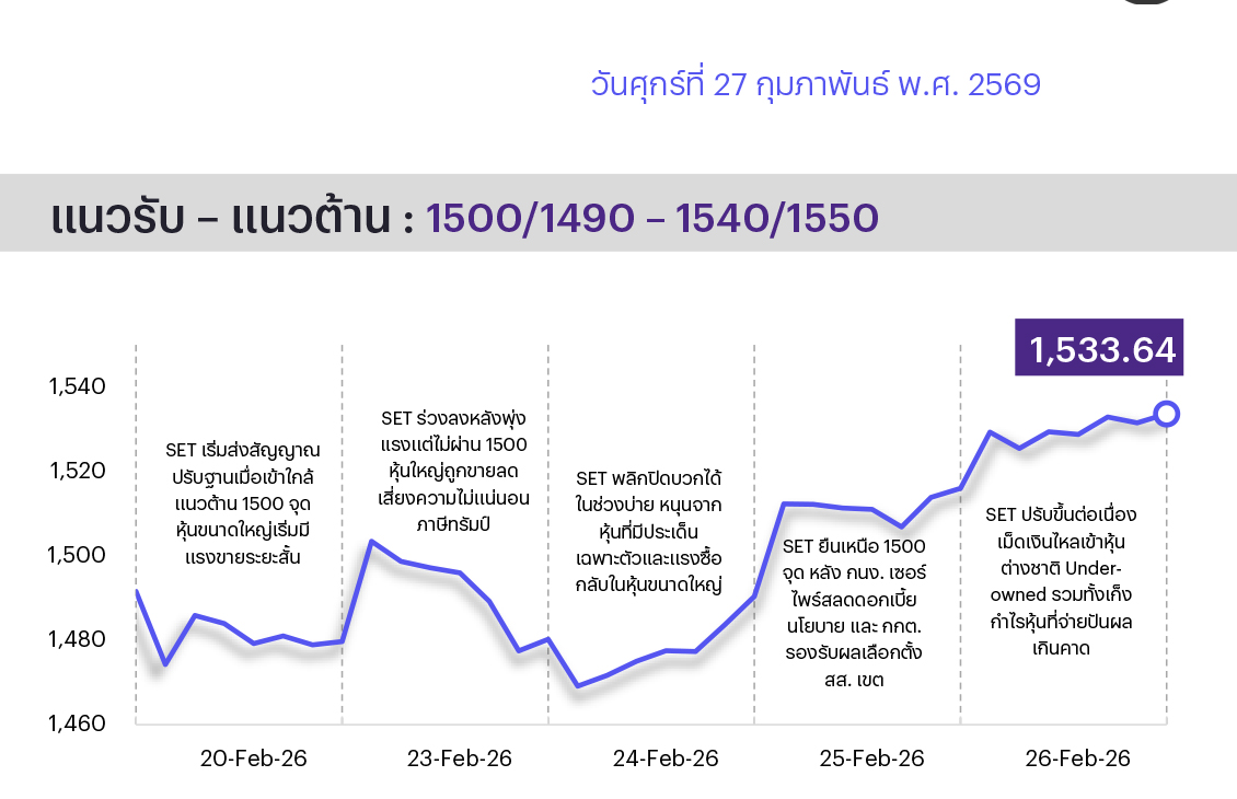 ช่วงสั้นมอง SET แกว่งตัวกรอบ 1460-1550 แม้ภาพรวมจะได้แรงหนุนจากการไหลเข้าของ Fund Flow หลังการเมืองไทยมีเสถียรภาพมากขึ้น และล่าสุด กนง. มีมติปรับลดดอกเบี้ยนโยบายลง 0.25% เพื่อหนุนนเศรษฐกิจ ซึ่งสร้าง Positive Surprise แก่ตลาด แต่มองดัชนีขึ้นมาตอบรับข่าวดี แล้วระดับนึงแล้ว ปัจจุบันดัชนีเทรด PER 2569F บริเวณ 16 เท่า ซึ่งเป็นค่าเฉลี่ยย้อนหลัง10 ปี อาจทำให้แรงส่งขึ้นเริ่มจำกัดและต้องระวังแรงขายทำกำไรสลับในระยะสั้นเพื่อลดความตึงตัวของ Valuation ปัจจัยติดตามสำคัญ ได้แก่ โค้งสุดท้ายของการประกาศงบ 4Q68 ของหุ้น Real Sector ซึ่งจะเห็นแรงเก็งกำไรในหุ้นที่งบออกมาดีหรือจ่ายเงินปันผลเด่น รวมทั้งนโยบายของ ปธน. ทรัมป์ เรื่องการเจรจาสหรัฐฯ-อิหร่าน (26 ก.พ.) ที่จะมีผลต่อบรรยากาศลงทุน ดังนั้นกลยุทธ์การลงทุนจึงแนะนำ “Selective Buy” เมื่อดัชนีย่อตัวลงมาใกล้แนวรับสำคัญที่ 1450/1420