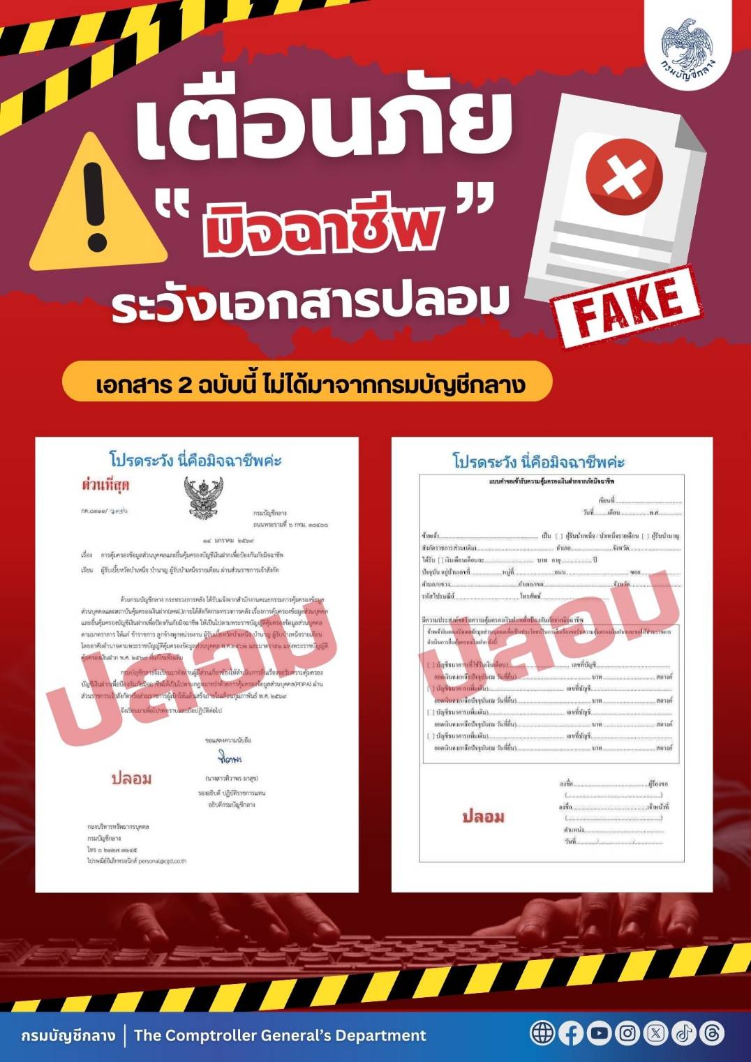 นางแพตริเซีย มงคลวนิช อธิบดีกรมบัญชีกลาง เปิดเผยว่า ขณะนี้มีเอกสารราชการปลอม ซึ่งแอบอ้างชื่อผู้บริหารของกรมบัญชีกลาง และแจ้งผู้รับเบี้ยหวัดบำเหน็จบำนาญ ผู้รับบำเหน็จรายเดือน เกี่ยวกับการคุ้มครองข้อมูลส่วนบุคคลและยื่นคุ้มครองบัญชีเงินฝากเพื่อป้องกันภัยมิจฉาชีพ โดยให้กรอกแบบคำขอเข้ารับการคุ้มครองเงินฝาก จากภัยมิจฉาชีพ ซึ่งอ้างว่ากรมบัญชีกลางให้ดำเนินการดังกล่าว เพื่อให้บัญชีเงินฝากของท่านมีความปลอดภัยยิ่งขึ้น ดังนั้น หากได้รับการติดต่อในลักษณะนี้ขออย่าได้หลงเชื่อ และขอให้ตรวจสอบกับหน่วยงานต้นสังกัดของท่านก่อนที่จะดำเนินการใด ๆ เนื่องจากมิจฉาชีพปรับเปลี่ยนรูปแบบการหลอกลวงอยู่เสมอ ขอให้ท่านระมัดระวังทุกเรื่องที่ได้รับการติดต่อมาเพื่อความปลอดภัยของตัวท่านเอง