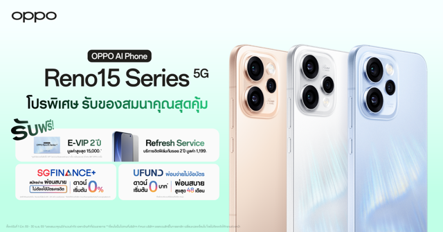 พิเศษสำหรับผู้ที่สนใจ OPPO Reno15 Series 5G เป็นเจ้าของได้ง่ายยิ่งขึ้นด้วย UFUND ดาวน์เริ่มต้น 0 บาท ผ่อนสบายสูงสุด 48 เดือน ไม่ต้องใช้บัตรเครดิต