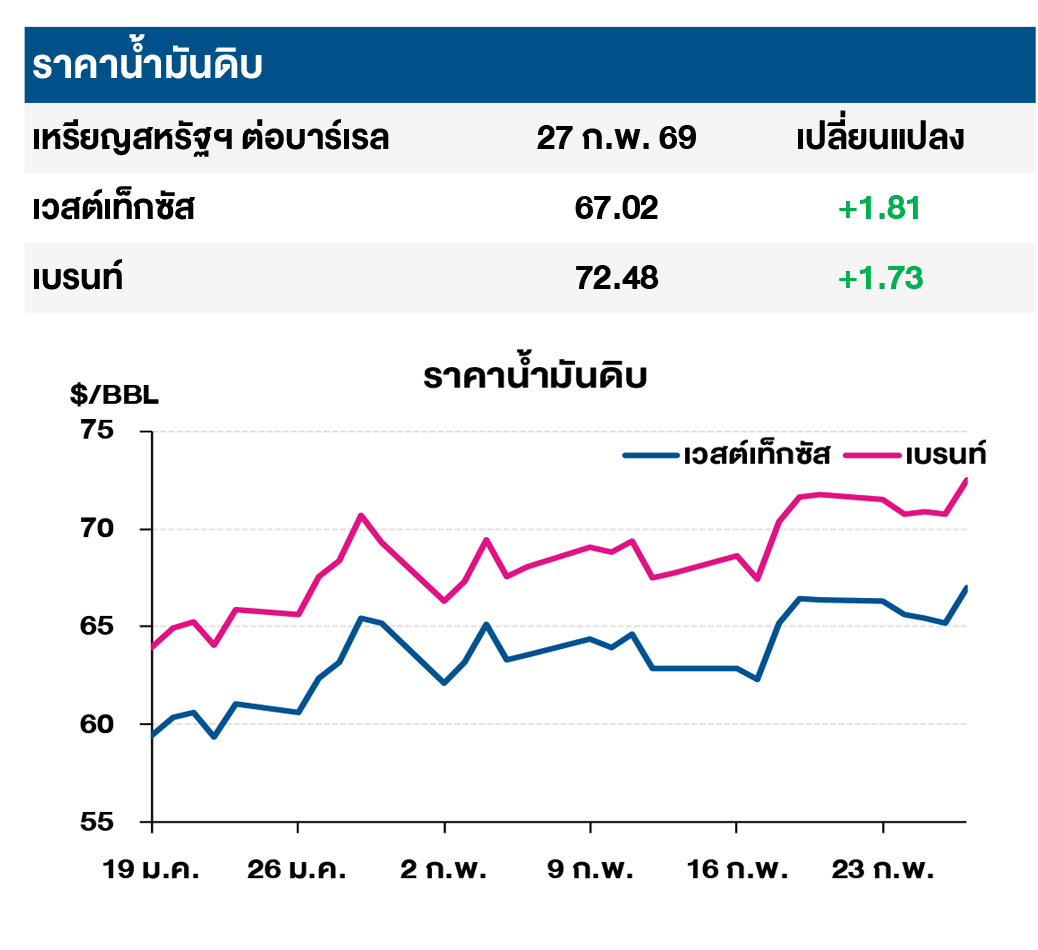 (+) ราคาน้ำมันดิบเวสต์เท็กซัสและเบรนท์ปรับเพิ่มขึ้น หลังตลาดกังวลอุปทานตึงตัวจากการสถานการณ์ความตึงเครียดระหว่างสหรัฐฯ และอิหร่าน ทั้งนี้ ตลาดปิดเมื่อวันที่ 28 ก.พ. 69 อิสราเอลและสหรัฐฯ ได้ปฏิบัติการโจมตีอิหร่านด้วยขีปนาวุธ และเกิดเหตุระเบิดในกรุงเตหะราน และหลายเมือง ส่งผลให้ตลาดกังวลความเสี่ยงหากมีการปิดช่องแคบฮอร์มุส ซึ่งจะทำให้อุปทานตึงตัว เนื่องจากอุปทานน้ำมันกว่า 20% ใช้ช่องแคบนี้ในการขนส่ง