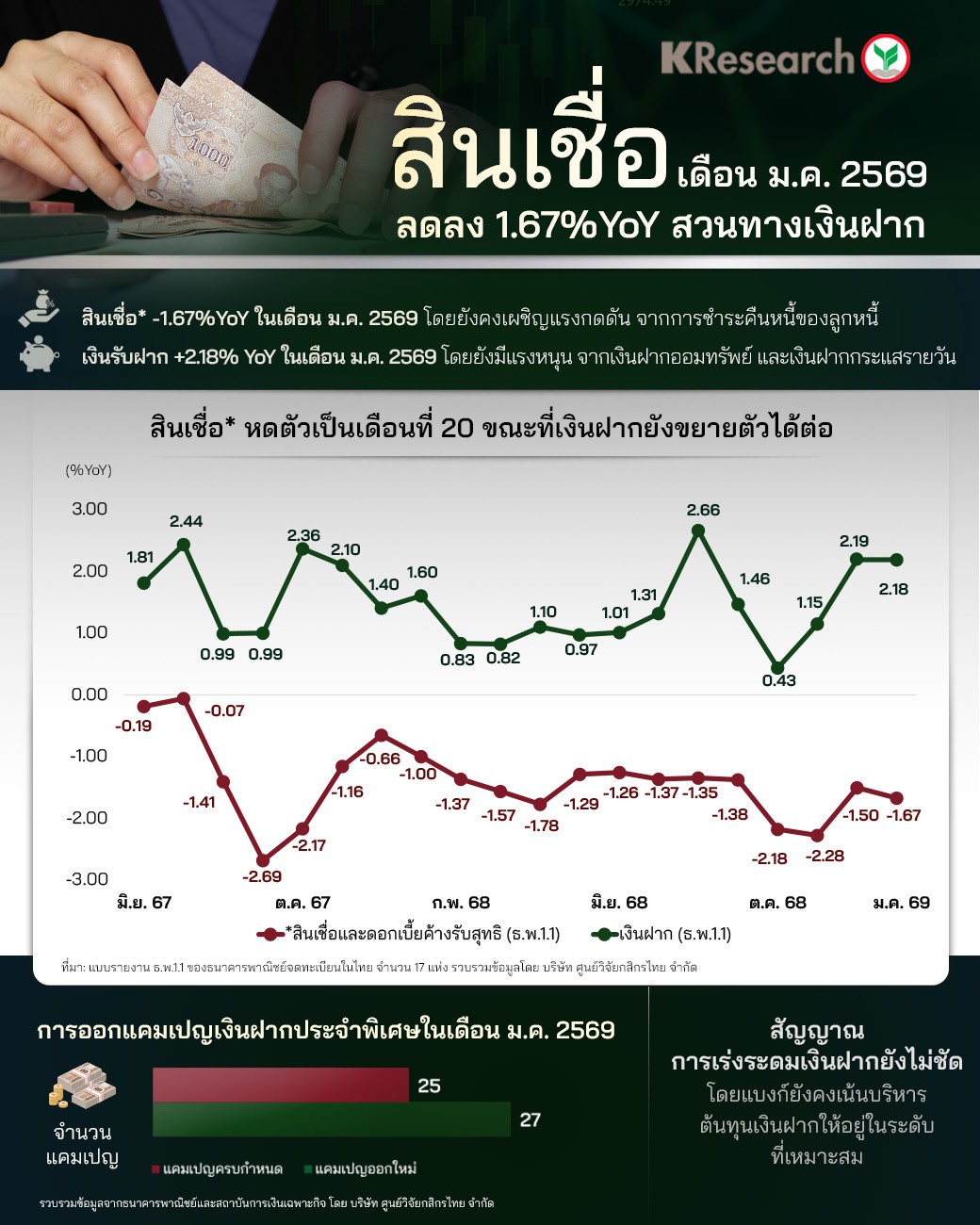 • ด้านเงินรับฝาก ณ สิ้นเดือน ม.ค. 2569 อยู่ที่ระดับ 16.50 ล้านล้านบาท ขยายตัว 2.18% YoY เทียบกับ 2.19% YoY ในเดือนธ.ค. 2568 โดยยังมีแรงหนุนจากเงินฝากออมทรัพย์และเงินฝากกระแสรายวัน สำหรับการออกแคมเปญเงินฝากประจำพิเศษในเดือนม.ค. 2569 นั้น พบว่า จำนวนแคมเปญออกใหม่ใกล้เคียงกับจำนวนแคมเปญที่ครบกำหนดและส่วนใหญ่ยังคงเป็นแคมเปญระยะสั้น ทั้งนี้ ธนาคารยังคงให้ความสำคัญกับการบริหารต้นทุนเงินฝากให้อยู่ในระดับที่เหมาะสม เนื่องจากสภาพคล่องโดยรวมยังอยู่ในระดับสูงและการฟื้นตัวของสินเชื่อยังมีข้อจำกัด