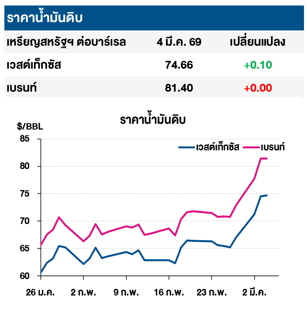 (+) ราคาน้ำมันดิบเวสต์เท็กซัสปรับเพิ่มขึ้นเล็กน้อย ในขณะที่น้ำมันดิบเบรนท์ ทรงตัวโดยตลาดยังคงเผชิญความผันผวน จากสงครามที่เกิดขึ้นต่อเนื่องหลังอิสราเอล และ สหรัฐฯ ได้ทำการเปิดปฏิบัติการโจมตีอิหร่านเป็นวันที่ 5 ส่งผลให้ภูมิภาคตะวันออกกลางมีความตึงเครียดมากขึ้น และการขนส่งทางเรือบริเวณช่องแคบฮอร์มุซซึ่งเป็นยุทธศาสตร์ที่สำคัญของการขนส่งน้ำมันดิบและก๊าซธรรมชาติหยุดชะงัก โดยสหรัฐฯ มีการส่งสัญญาณว่าจะมีการปฏิบัติการทางทหารเป็นเวลา 4-5 สัปดาห์ ในขณะที่อิหร่านมีความพยายามที่จะสร้างความขัดแย้งไปสู่ระดับภูมิภาค