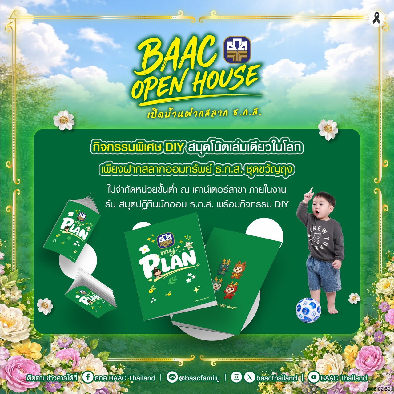 ธนาคารเพื่อการเกษตรและสหกรณ์การเกษตร (ธ.ก.ส.) ชวนร่วมงานเปิดบ้านฝากสลาก ธ.ก.ส. กับกิจกรรม BAAC Open House เพื่อเปิดประสบการณ์คนเมืองในการสร้างเสริมพฤติกรรมการออมเงิน ผ่านเงินฝากและสลากออมทรัพย์ ธ.ก.ส. โดยภายในงานมีบูธให้บริการทางการเงินจาก ธ.ก.ส. ได้แก่ การรับฝากสลากออมทรัพย์ ธ.ก.ส. ชุดกระพ้อมทอง หน่วยละ 500 บาท ลุ้นโชคใหญ่ 20 ล้านบาท และรางวัลอื่น ๆ รวมมูลค่ากว่า 86 ล้านบาทต่อเดือน จำนวน 24 ครั้ง เมื่อฝากครบ 2 ปี ได้รับดอกเบี้ยหน่วยละ 3 บาท และชุดกระพ้อมเงิน หน่วยละ 100 บาท ลุ้นรางวัลใหญ่ 10 ล้านบาท ที่มาพร้อมรางวัลพิเศษอีกรางวัลละ 1 ล้านบาท ปีละ 3 ครั้ง รวม 30 ล้านบาท และรางวัลอื่น ๆ รวมมูลค่ากว่า 109 ล้านบาทต่อเดือน จำนวน 24 ครั้ง ฝากครบ 2 ปี รับดอกเบี้ยหน่วยละ 0.25 บาท พร้อมโปรโมชันสุดพิเศษเฉพาะในงาน ได้แก่ เมื่อฝากสลากออมทรัพย์ชุดใดก็ได้ จำนวน 20,000 บาท รับหมอนผ้าห่ม Agri Animal จำนวน 1 ชิ้น คละแบบ เมื่อฝากสลากฯ 50,000 บาท รับหมอนผ้าห่ม Agri Animal จำนวน 2 ชิ้น คละแบบ และเมื่อฝากสลากฯ 1,000,000 บาท รับหมอนผ้าห่ม Agri Animal จำนวน 4 ชิ้น ครบเซ็ต ไม่ซ้ำแบบ เพียงทำธุรกรรมที่เคาน์เตอร์สาขาภายในงาน (ยกเว้นการปรับสมุดและถอนเงิน) รับคูปองลุ้นของที่ระลึกจาก ธ.ก.ส. สุด Limited Edition มากมาย