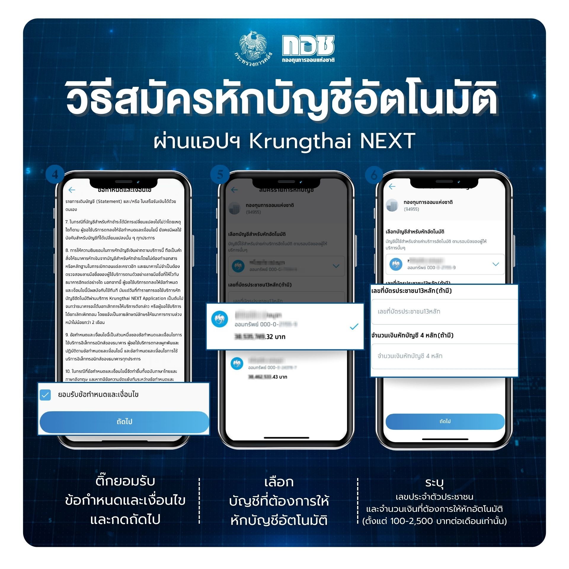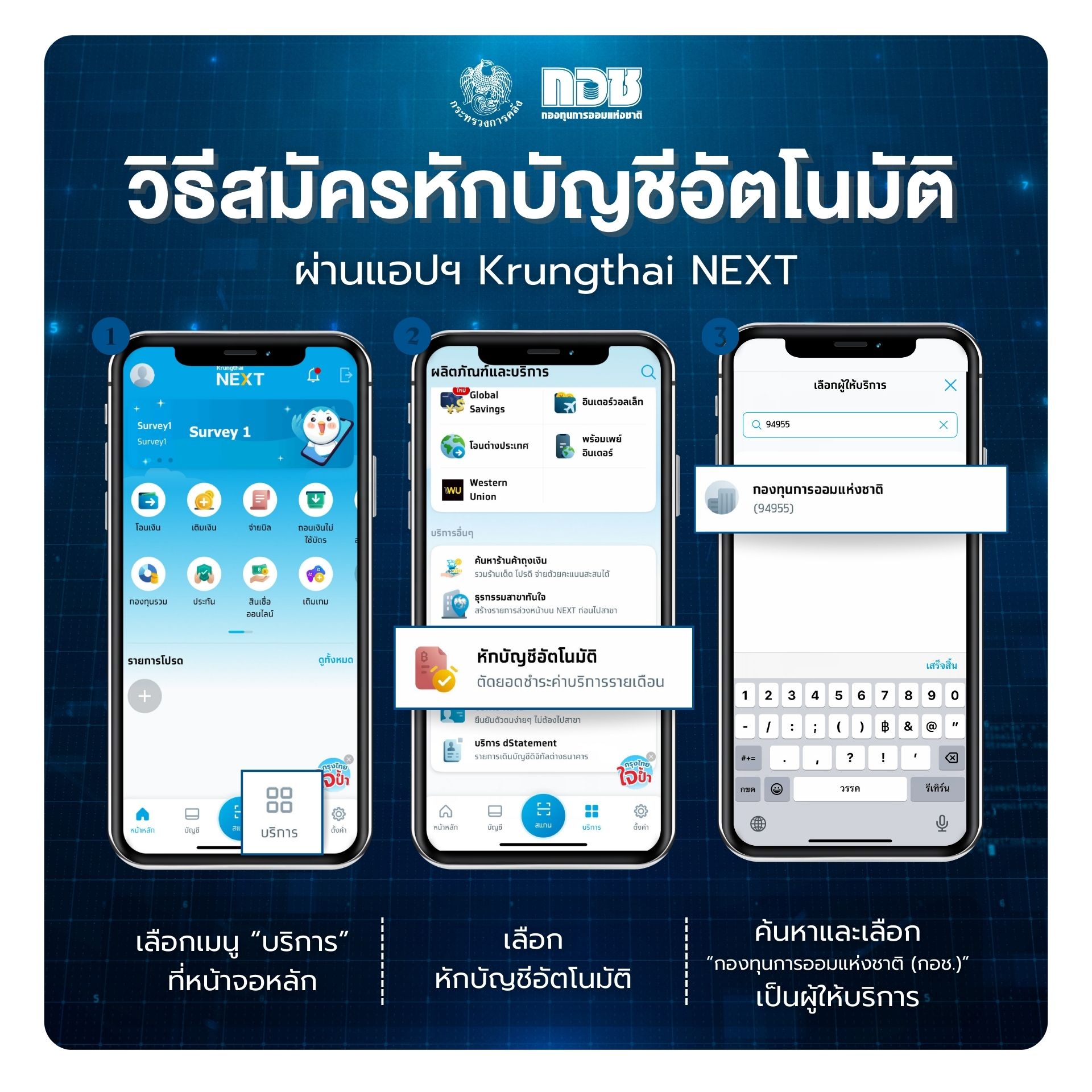 สำหรับสมาชิก กอช. ที่มีบัญชีธนาคารกรุงไทย สามารถตั้งค่าการออมอัตโนมัติได้ด้วยตนเอง ตามขั้นตอนดังนี้ โดยเข้าแอปพลิเคชัน Krungthai NEXT เลือกเมนู “บริการ” แล้วเลือกหัวข้อ “หักบัญชีอัตโนมัติ” และ “เลือกผู้ให้บริการ” พร้อมค้นหาคำว่า “กองทุนการออมแห่งชาติ” หรือ รหัส 94955 ตรวจสอบข้อกำหนดและเงื่อนไข กด “ยอมรับ” และกด “ถัดไป” เลือกบัญชีที่ต้องการให้หักเงิน ระบุเลขบัตรประชาชน 13 หลัก และระบุจำนวนเงินที่ต้องการออม เริ่มต้นตั้งแต่ 100 - 2,500 บาทต่อเดือน และกด “ยืนยัน” ข้อมูล ระบบจะแสดง E-Slip เป็นหลักฐานว่า การสมัครเสร็จสมบูรณ์