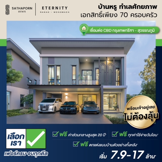 โครงการ “อิเธอร์นิตี้ พระราม 9 – วงแหวนฯ” ( ETERNITY RAMA 9 - WONGWAEN) บ้านเดี่ยวหลังใหญ่ กรุงเทพกรีฑา เชื่อมต่อแหล่ง CBD พระราม 9 เอกสิทธิ์เพียง 70 ยูนิต ในราคาเริ่มต้น 7.9 - 17 ล้านบาท*