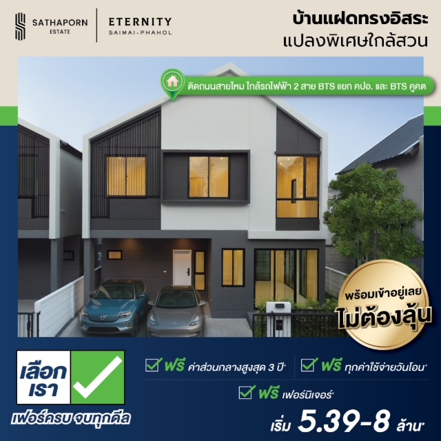 โครงการ “อิเธอร์นิตี้ สายไหม-พหลฯ” (ETERNITY SAIMAI-PHAHOL) บ้านแฝดสไตล์นอร์ดิก ติดถนนหลักสายไหม ใกล้รถไฟฟ้า 2 สถานี ในราคาเริ่มต้น 5.39 - 8 ล้านบาท*