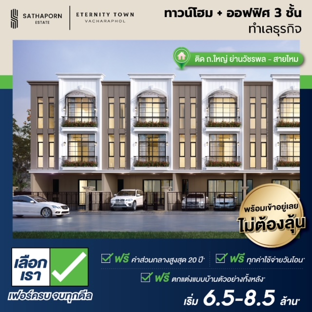 โครงการ “อิเธอร์นิตี้ ทาวน์ วัชรพล” (ETERNITY TOWN VACHARAPHOL) ทาวน์โฮม 3 ชั้น ไลฟ์สไตล์ธุรกิจ ติดถนนใหญ่ย่านวัชรพล – สายไหม ในราคาเริ่มต้น 6.5 – 8.5 ล้านบาท*