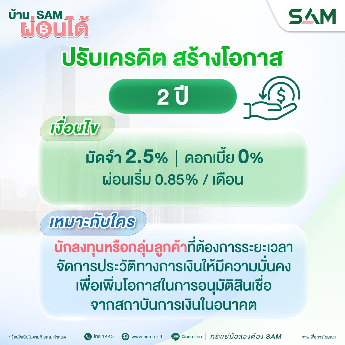 บริษัท บริหารสินทรัพย์สุขุมวิท จำกัด (บสส.) หรือ SAM เดินนหน้าภารกิจสำคัญ "ส่งมอบโอกาสเพื่อคนไทย เริ่มต้นใหม่อย่างยั่งยืน" เปิดตัวแคมเปญพิเศษ "บ้าน SAM ผ่อนได้" โดยคัดทรัพย์สินรอการขาย (NPA) ประเภทที่อยู่อาศัย ไม่ว่าจะเป็น บ้านเดี่ยว ทาวน์เฮาส์ บ้านแฝด คอนโดมิเนียม และอาคารพาณิชย์ กว่า 3,300 รายการ บนทำเลศักยภาพทั่วประเทศ ออกจำหน่ายพร้อมเงื่อนไขทางการเงินที่ช่วยประชาชนสามารถเข้าถึงที่อยู่อาศัยได้ง่ายขึ้น โดยแคมเปญพิเศษ “บ้าน SAM ผ่อนได้” ดังกล่าว ลูกค้าสามารถผ่อนชำระโดยตรงกับ SAM ได้นานสูงสุดถึง 4 ปี พร้อมรับ อัตราดอกเบี้ยพิเศษ 0% ใน 2 ปี หรือ 24 เดือนแรก โดย SAM ได้ออกแบบเงื่อนไขการผ่อนชำระให้มีความยืดหยุ่นถึง 5 ทางเลือก เพื่อให้สอดคล้องกับรายได้และความสามารถทางการเงินที่แท้จริงของลูกค้าแต่ละราย และ พิเศษยิ่งขึ้น!! สำหรับลูกค้าที่ชำระเงินครบ 5% ของราคาประกาศขาย สามารถเข้าใช้ประโยชน์ในทรัพย์สินได้ทันที ภายใต้เงื่อนไขที่กำหนด
