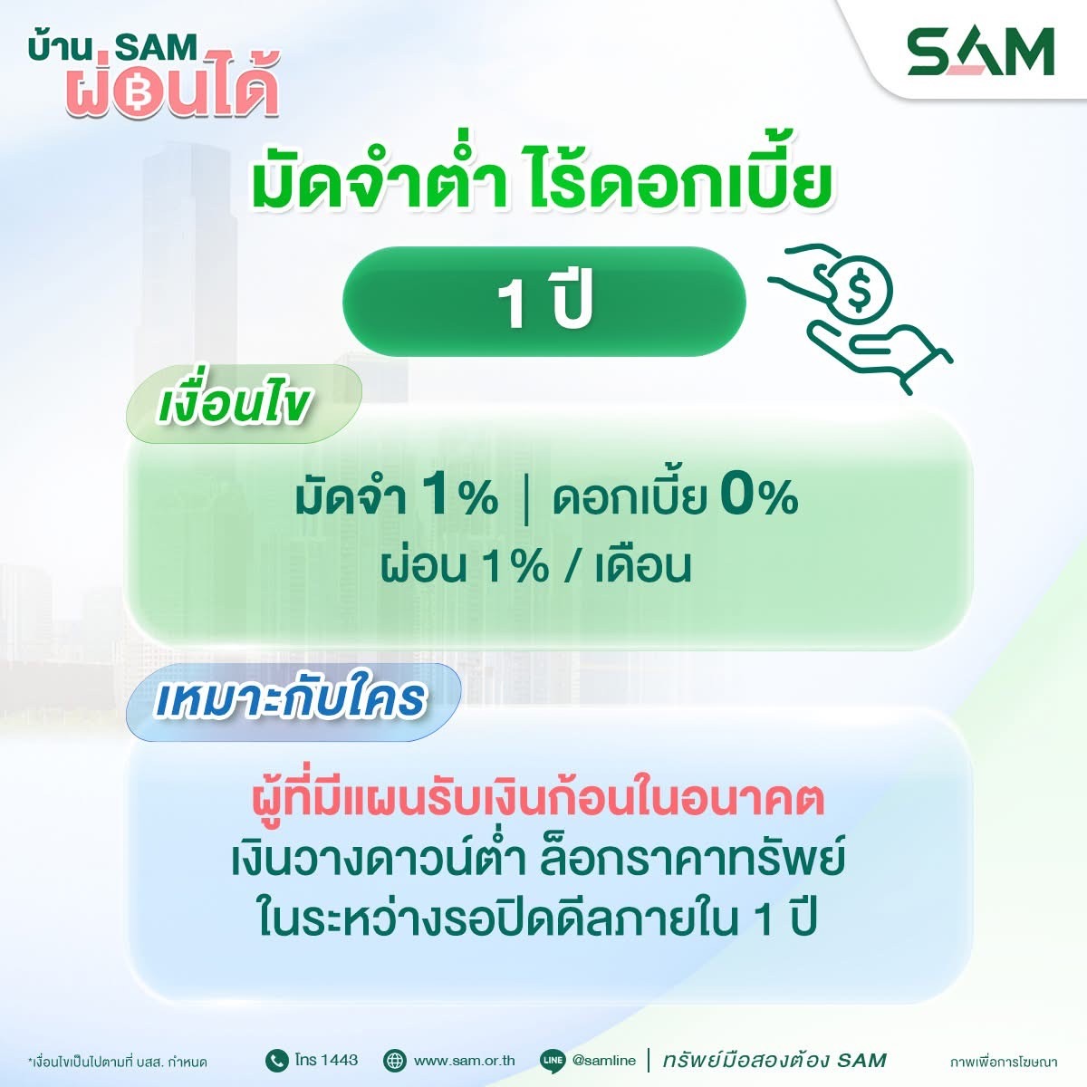 นอกจากนี้ SAM ยังมีโปรโมชัน “SAM ทรัพย์มือสองต้องบอกต่อ” สำหรับลูกค้าที่แนะนำทรัพย์ของ SAM ให้กับเพื่อนหรือคนรู้จักมาซื้อทรัพย์ได้สำเร็จ จะได้รับค่าแนะนำสูงสุดถึง 3 ล้านบาทต่อ 1 รายการ ภายใต้เงื่อนไขที่กำหนดอีกด้วย ลูกค้าที่สนใจสามารถสอบถามรายละเอียดเพิ่มเติมได้ที่ Call Center 1443 กด 2 และดูรายละเอียดทรัพย์สินได้ทางเว็บไซต์ที่ www.sam.or.th รวมทั้งช่องทางออนไลน์ที่หลากหลายและสะดวกรวดเร็ว โดยแอด ID Line @Samline ติดตาม Facebook /YouTube / TikTok ได้ที่ "SAM บริหารสินทรัพย์สุขุมวิท" เพื่อติดตามข้อมูลข่าวสารดี ๆ จาก SAM