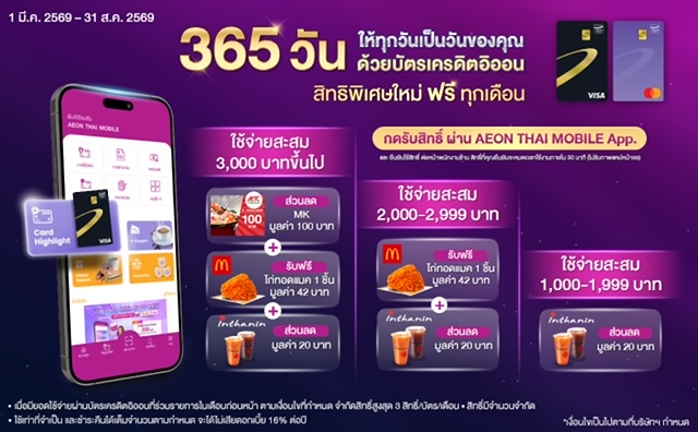 บริษัท อิออน ธนสินทรัพย์ (ไทยแลนด์) จำกัด (มหาชน) เดินหน้าสานต่อแคมเปญ “365 วัน ให้ทุกวันเป็นวันของคุณ” ต่อเนื่อง ตอกย้ำความมุ่งมั่นในการพัฒนาสิทธิประโยชน์และเติมเต็มไลฟ์สไตล์การใช้จ่ายในชีวิตประจำวันของลูกค้า โดยมอบข้อเสนอสุดพิเศษสำหรับผู้ถือบัตรเครดิตอิออน ผ่านการเติมความสุขกับอาหารและเครื่องดื่มเมนูโปรดจากแบรนด์ดังได้คุ้มยิ่งขึ้น เพียงใช้จ่ายผ่านบัตรเครดิตอิออนที่ร่วมรายการ ครบตามเงื่อนไขในเดือนก่อนหน้า รับส่วนลด E-voucher MK มูลค่า 100 บาท รับฟรีไก่ทอด จาก McDonald’s มูลค่า 42 บาท และรับส่วนลด 20 บาท ที่ร้าน Inthanin Coffee โปรโมชันพร้อมเสิร์ฟระหว่างวันที่ 1 มีนาคม 2569 – 31 สิงหาคม 2569