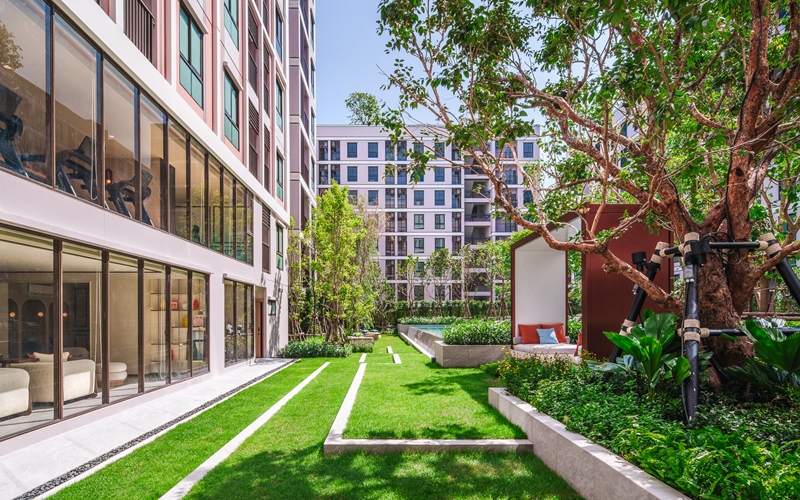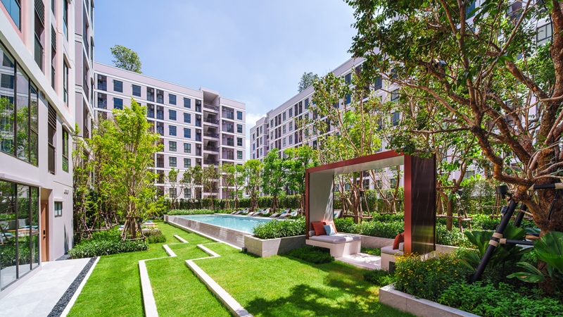 · Vacation Vibes: พักผ่อนอย่างเต็มสูบกับไฮไลต์ VACATION POOL สระว่ายน้ำระบบเกลือความยาวกว่า 20 เมตร โอบล้อมด้วยพื้นที่สีเขียว THE GREEN STEP