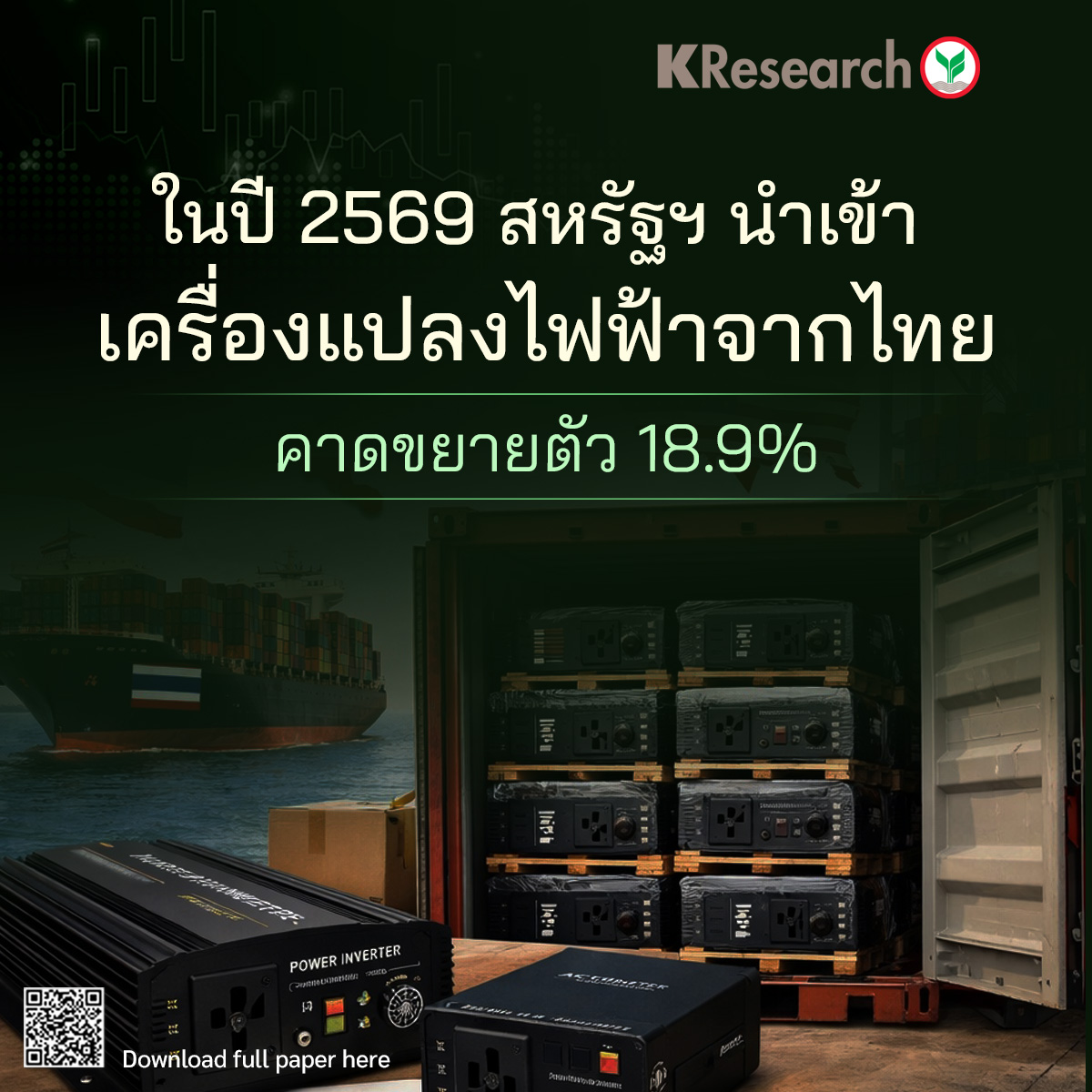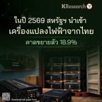 · ศูนย์วิจัยกสิกรไทยประเมินว่า ในปี 2569 มูลค่าการนำเข้าเครื่องแปลงไฟฟ้าของสหรัฐฯ จากไทย มีแนวโน้มขยายตัวราว 18.9%