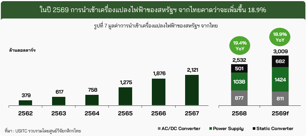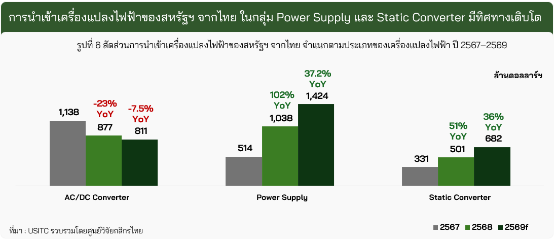 · Static Converter: ในปี 2569 ศูนย์วิจัยกสิกรไทยประเมินว่า มูลค่าการนำเข้าของสหรัฐฯ จากไทยในกลุ่มนี้ จะขยายตัวราว 36%YoY (รูปที่ 6)