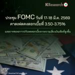 ในการประชุม FOMC วันที่ 17-18 มี.ค. 2569 คาดเฟดมีมติคงดอกเบี้ยนโยบายที่ 3.50-3.75% เพื่อรอประเมินแนวโน้มเศรษฐกิจและเงินเฟ้อท่ามกลางความไม่แน่นอนที่สูงขึ้นจากความขัดแย้งในตะวันออกกลาง โดยตัวเลขตลาดแรงงานและเงินเฟ้อล่าสุดยังไม่ได้สะท้อนภาพความตึงเครียดในตะวันออกกลางที่ปะทุขึ้น
