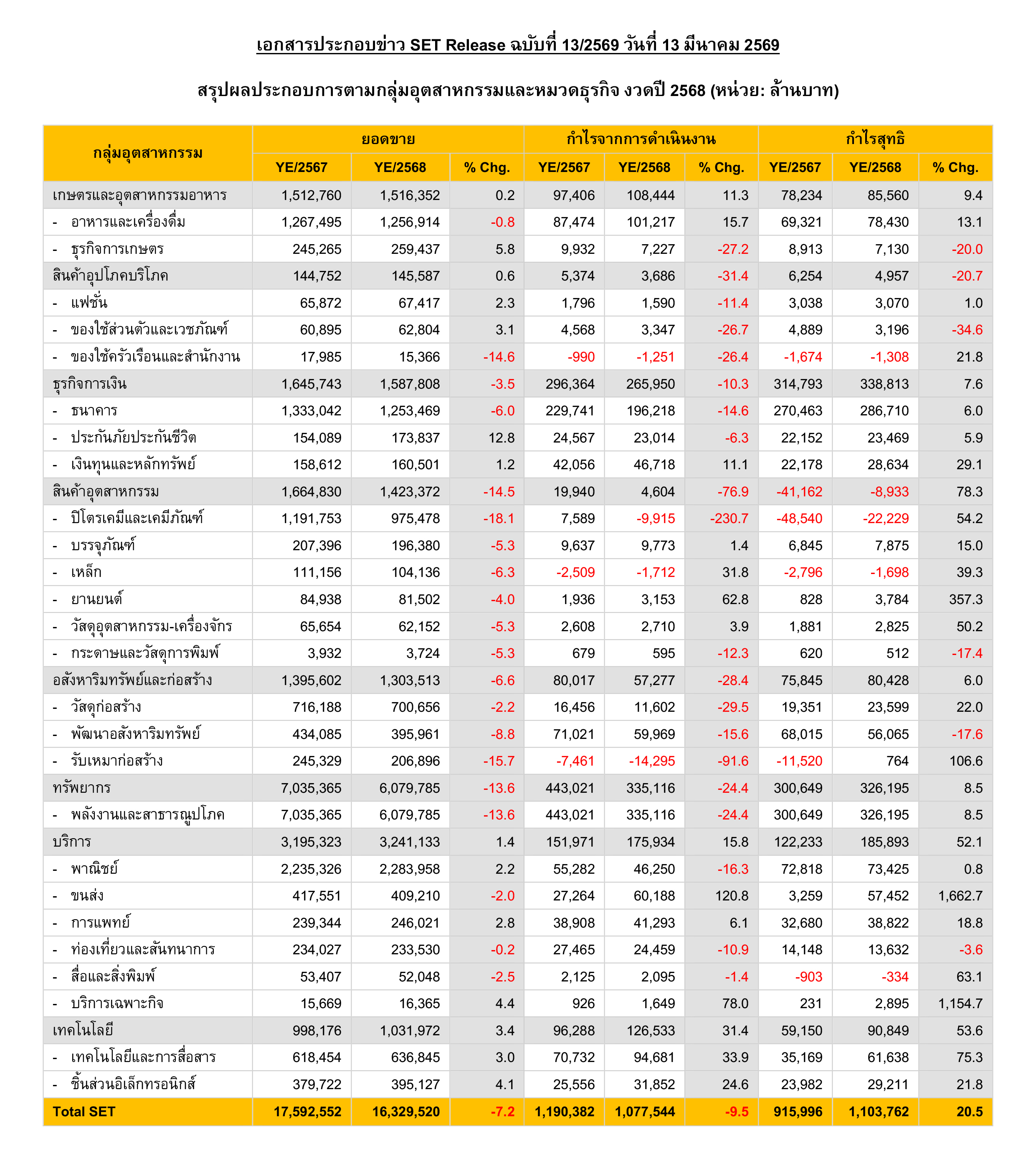ผลการดำเนินงานปี 2568 เทียบกับปีก่อน บจ. ใน SET มียอดขาย 16,329,520 ล้านบาท ลดลง 7.2% โดย บจ. มีการควบคุมต้นทุนขายได้ค่อนข้างดี แต่มีค่าใช้จ่ายการขายและบริหารลดลงเพียง 3.0% ทำให้มีกำไรจากการดำเนินงาน (Core profit) 1,077,544 ล้านบาท ลดลง 9.5% อย่างไรก็ดี บจ. ขนาดใหญ่หลายแห่งมีกำไรจากการควบรวมกิจการ การปรับโครงสร้างธุรกิจ การลงทุนและเครื่องมือทางการเงิน ส่งผลให้มีกำไรสุทธิ 1,103,762 ล้านบาท เพิ่มขึ้น 20.5% ด้านฐานะการเงินของ บจ. ณ วันที่ 31 ธันวาคม 2568 มีอัตราส่วนหนี้สินต่อทุน หรือ D/E ratio (ไม่รวมอุตสาหกรรมการเงิน) อยู่ที่ 1.28 เท่า ลดลงจาก 1.34 เท่า ในปีก่อน