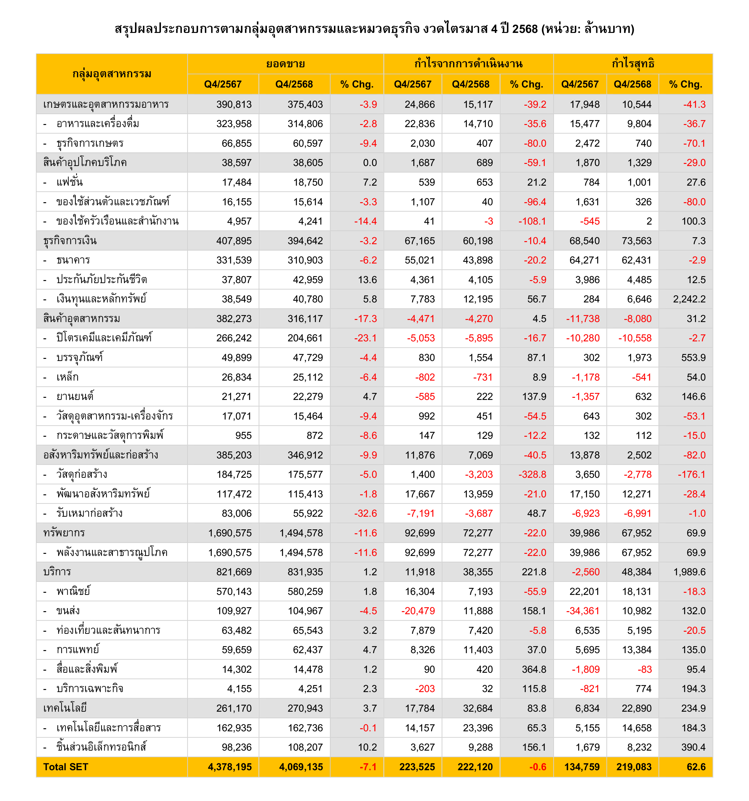 “ในปี 2568 บจ. ไทยมีผลประกอบการที่อ่อนแอลงจากเศรษฐกิจชะลอตัว ประกอบกับปัจจัยด้านราคาน้ำมันลดลง และการปรับลดอัตราดอกเบี้ยนโยบายถึง 4 ครั้ง ส่งผลให้ บจ. ไทยในหมวดพลังงาน หมวดปิโตรเคมีภัณฑ์ และกลุ่มธุรกิจการเงินมียอดขายลดลง ในขณะที่ค่าใช้จ่ายการขายและบริหารโดยรวมไม่ได้ปรับลดลงมากนัก ทำให้ บจ. ไทยมีกำไรจากการดำเนินงานลดลง อย่างไรก็ดี บจ. ที่ยังคงมีการเติบโต ได้แก่ หมวดธุรกิจอาหารจากราคาไก่และน้ำมันปาล์มที่เพิ่มขึ้น หมวดธุรกิจโรงพยาบาล และหมวดธุรกิจเทคโนโลยีที่เติบโตตามการปรับเข้าสู่สังคม Digital” นายสรวิศ กล่าว