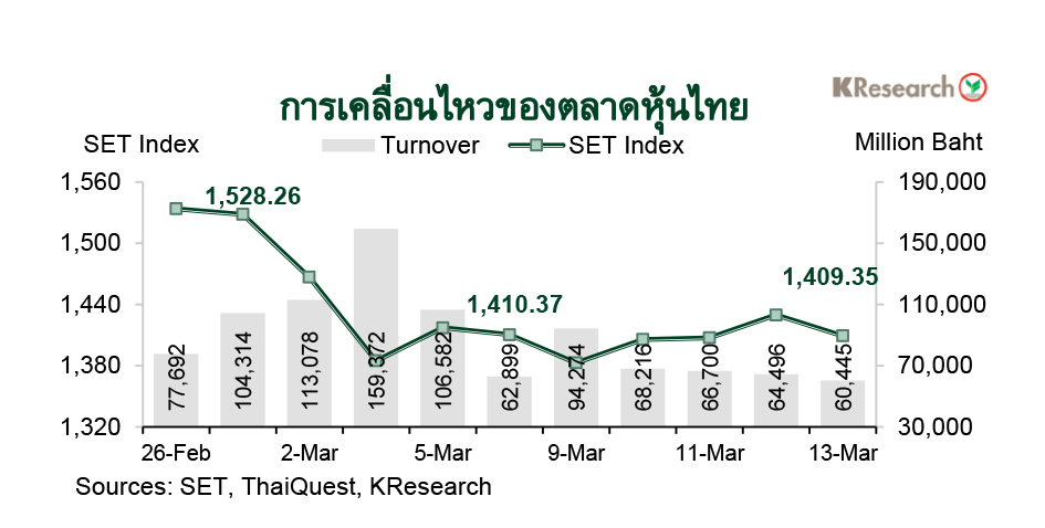 · สัปดาห์ถัดไป (16-20 มี.ค. 69) บริษัทหลักทรัพย์กสิกรไทย จำกัด มองว่า ดัชนีหุ้นไทยมีแนวรับที่ 1,390 และ 1,360 จุด ขณะที่แนวต้านอยู่ที่ 1,430 และ 1,460 จุด ตามลำดับ โดยศูนย์วิจัยกสิกรไทยประเมินปัจจัยสำคัญที่ต้องติดตาม ได้แก่ การประชุมเฟด (17-18 มี.ค.) สถานการณ์ตึงเครียดในตะวันออกกลาง ประเด็นการเมืองในประเทศ และทิศทางเงินทุนต่างชาติ ส่วนตัวเลขเศรษฐกิจสหรัฐฯ ที่สำคัญ ได้แก่ ผลผลิตภาคอุตสาหกรรม ดัชนีราคาผู้ผลิตเดือนก.พ. ยอดขายบ้านใหม่เดือนม.ค.