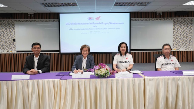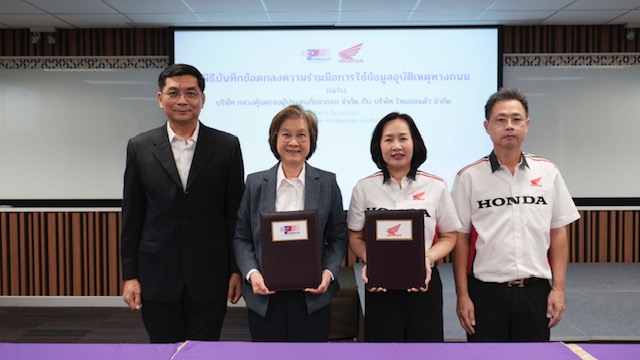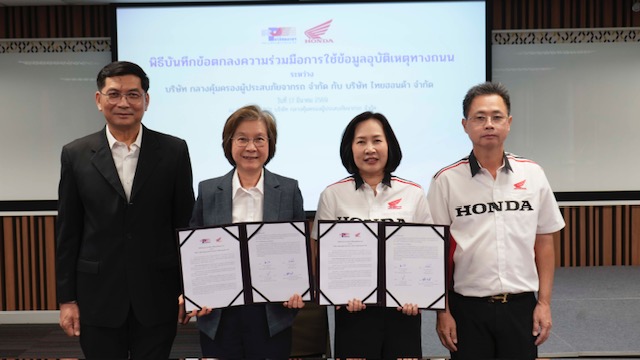 นางสาวพรรณี ปิติกุลตัง กรรมการผู้จัดการ บริษัท กลางคุ้มครองผู้ประสบภัยจากรถ จำกัด พร้อมด้วย นางสาวิตรี แก้วพวงงาม กรรมการบริหาร บริษัท ไทยฮอนด้า จำกัด ร่วมลงนามในบันทึกข้อตกลงความร่วมมือด้านการใช้ข้อมูลอุบัติเหตุทางถนน ความร่วมมือในครั้งนี้มีวัตถุประสงค์เพื่อสนับสนุนการนำข้อมูลอุบัติเหตุไปใช้ในการประเมินผล และพัฒนาหลักสูตรการอบรมขับขี่ปลอดภัยสำหรับผู้ใช้รถจักรยานยนต์อย่างมีประสิทธิภาพ อันจะช่วยยกระดับมาตรฐานความปลอดภัยในการใช้รถใช้ถนน และเป็นกลไกสำคัญในการลดอุบัติเหตุ รวมถึงการสูญเสียชีวิตและทรัพย์สินบนท้องถนนของประเทศไทย ณ ห้องประชุม 501 บริษัท กลางคุ้มครองผู้ประสบภัยจากรถ จำกัด สำนักงานใหญ่