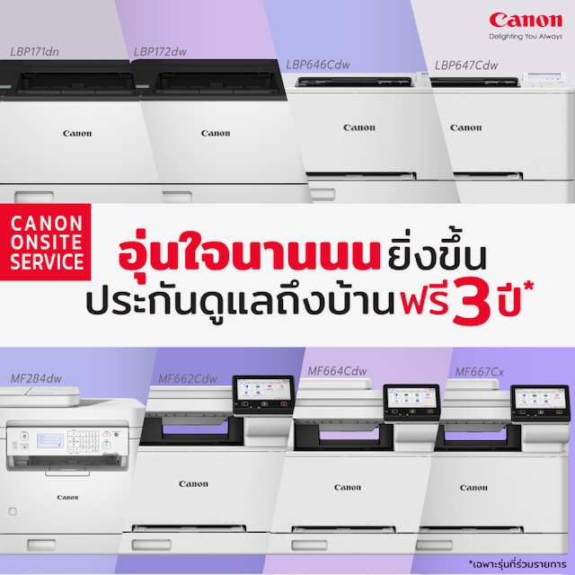 สำหรับลูกค้าที่ซื้อเครื่องพิมพ์รุ่นที่ร่วมรายการ จะได้รับสิทธิ์รับประกันซ่อมนอกสถานที่นาน 3 ปีอัตโนมัติ โดยไม่ต้องลงทะเบียนขอรับสิทธิ์ (สำหรับลูกค้าเก่าที่ซื้อไปก่อนหน้านี้ ยังคงได้รับสิทธิ์ตามโปรโมชัน โดยเริ่มนับย้อนหลังจากวันที่ซื้อผลิตภัณฑ์) หลังการติดต่อ ทีมช่างของแคนนอนจะเข้าถึงหน้างานภายใน 3–5 วันทำการ (กรณีที่มีอะไหล่พร้อม) เพื่อทำการตรวจซ่อมเครื่องพิมพ์และสนับสนุนให้การทำงานของลูกค้ากลับสู่สภาวะปกติโดยเร็ว
