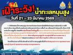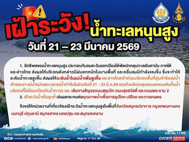 1. อิทธิพลของน้ำทะเลหนุนสูง ประกอบกับลมตะวันออกเฉียงใต้พัดปกคลุมทะเลอันดามัน ภาคใต้ และอ่าวไทย ส่งผลให้บริเวณดังกล่าวมีฝนตกหนักในบางพื้นที่ และคลื่นลมมีกำลังแรงขึ้น ซึ่งจะทำให้ระดับน้ำทะเลสูงขึ้น ส่งผลให้ระดับน้ำในแม่น้ำเพิ่มสูงขึ้น และอาจไหลเข้าท่วมบริเวณพื้นที่ลุ่มต่ำริมแม่น้ำเจ้าพระยา แม่น้ำแม่กลอง และแม่น้ำท่าจีนในช่วงวันที่ 21 - 23 มี.ค.69 รวมถึงบริเวณชุมชนนอกแนวคันกั้นน้ำ บริเวณที่ไม่มีแนวป้องกันน้ำถาวร และ เส้นทางสัญจรถนนสุขุมวิท ถนนสุขสวัสดิ์ และถนนพระราม 2