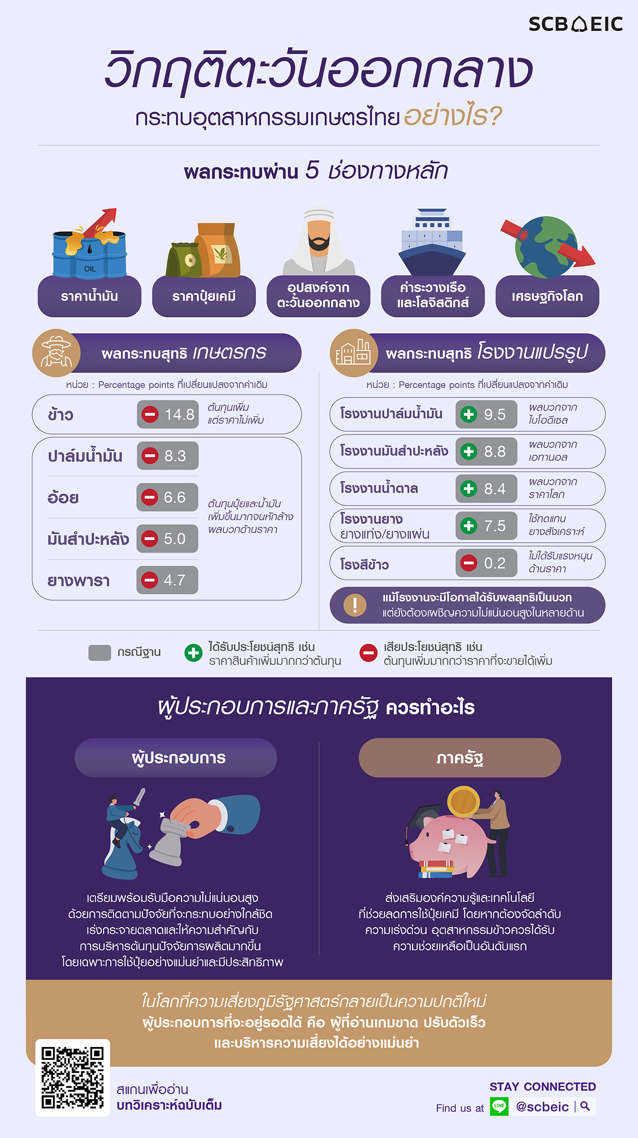 SCB EIC ประเมินผลกระทบผ่านการวิเคราะห์ความอ่อนไหวของราคาสินค้าต่อราคาน้ำมันและ GDP โลก และผลกระทบของราคาน้ำมันและราคาปุ๋ยต่อโครงสร้างต้นทุน ภายใต้ 2 ฉากทัศน์ คือ กรณีฐานที่ราคาน้ำมันดิบ Brent เฉลี่ยทั้งปี 2026 อยู่ที่ 80 ดอลลาร์สหรัฐต่อบาร์เรล ราคาปุ๋ยเพิ่มขึ้นสูงกว่ากรณีปกติ 28.6 pp และ GDP โลกต่ำกว่ากรณีปกติ 0.2 pp และกรณีรุนแรงที่ราคาน้ำมันเพิ่มเป็น 110 ดอลลาร์สหรัฐต่อบาร์เรล ราคาปุ๋ยเพิ่มขึ้นสูงกว่ากรณีปกติ 64.5 pp และ GDP โลกต่ำกว่ากรณีปกติ 0.9 pp ซึ่งจากผลการประเมินพบว่า เกษตรกรผู้ปลูกพืช 5 ชนิดมีแนวโน้มได้รับผลกระทบสุทธิเป็นลบ โดยเกษตรกรผู้ปลูกข้าวจะได้รับผลกระทบหนักสุด ตามมาด้วยปาล์มน้ำมัน อ้อย มันสำปะหลังและยางพารา จากต้นทุนปุ๋ยและน้ำมันที่จะเพิ่มขึ้นค่อนข้างมาก จนหักล้างผลบวกด้านราคา ในทางตรงกันข้าม โรงงานแปรรูปยางพารา โรงงานน้ำตาล โรงงานสกัดน้ำมันปาล์มและโรงงานแปรรูปมันสำปะหลัง จะได้รับผลกระทบสุทธิเป็นบวก จากผลของราคาที่จะเพิ่มขึ้น ทั้งนี้โรงงานสกัดปาล์มน้ำมัน จะได้รับผลบวกสุทธิมากที่สุดจากความเชื่อมโยงกับไบโอดีเซล รองลงมา คือ โรงงานแปรรูปมันสำปะหลังจากความต้องการเอทานอล โรงงานน้ำตาลจากราคาน้ำตาลโลกที่มีแนวโน้มสูงขึ้น และโรงงานยางพาราจากการถูกนำไปใช้ทดแทนยางสังเคราะห์ อย่างไรก็ดี ผู้ประกอบการกลุ่มนี้ยังต้องเผชิญความไม่แน่นอนสูง