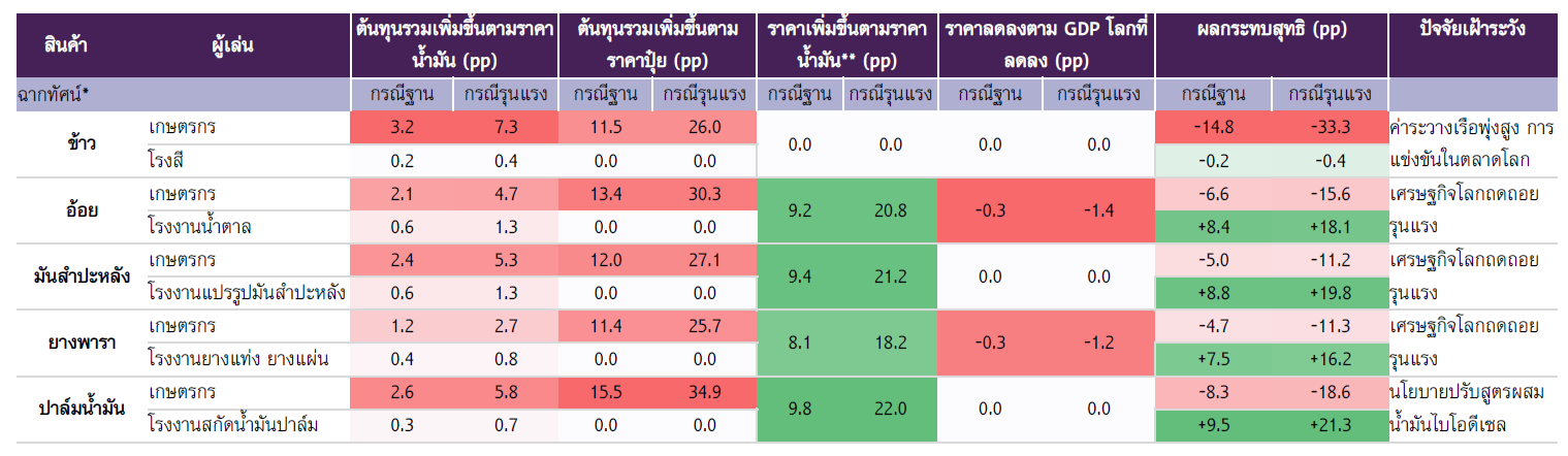 *กรณีฐาน น้ำมัน +35 pp (80 ดอลลาร์สหรัฐต่อบาร์เรล) ราคาปุ๋ย +28.6 pp GDP โลก -0.2 pp, กรณีรุนแรง น้ำมัน + 79 pp (110 ดอลลาร์สหรัฐต่อบาร์เรล) ราคาปุ๋ย +64.5 pp GDP โลก -0.9 pp และสูตรการคำนวณมีดังนี้ ผลกระทบสุทธิ (percentage point ที่เปลี่ยนแปลงไปจากค่าเดิม) = [ราคาน้ำมันที่เพิ่มขึ้น × ความอ่อนไหวของราคาต่อราคาน้ำมัน] − [ราคาน้ำมันที่เพิ่มขึ้น × สัดส่วนต้นทุนน้ำมัน] – [ราคาปุ๋ยที่เพิ่มขึ้น x สัดส่วนต้นทุนปุ๋ย] + [GDP โลกที่เปลี่ยนแปลง × ความอ่อนไหวของราคาต่อ GDP โลก]